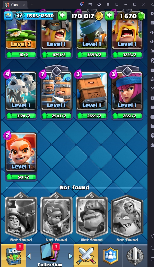 7532 TROPHY 🏆 37 LVL 💯 KT 12 👑 113 CARDS ♦️ 1 MAX CARDS 👑 0 ELITE CARDS 🔮 1 EVO 💯 EMOTE 31 🎭 #8GQYC0RQY ⸱ TAG ACCOUNT ♥️