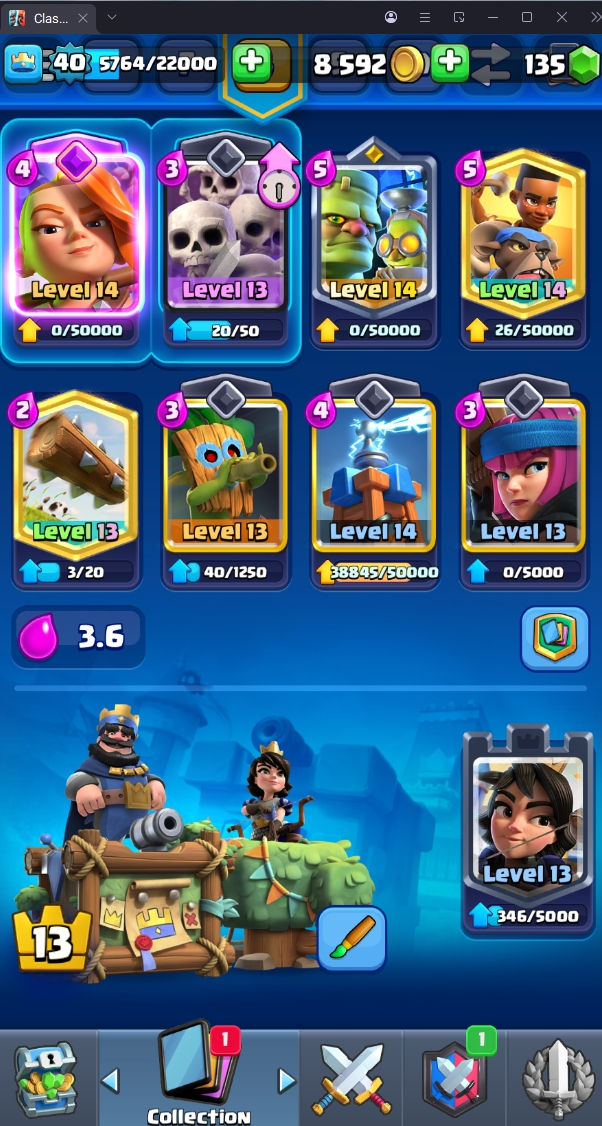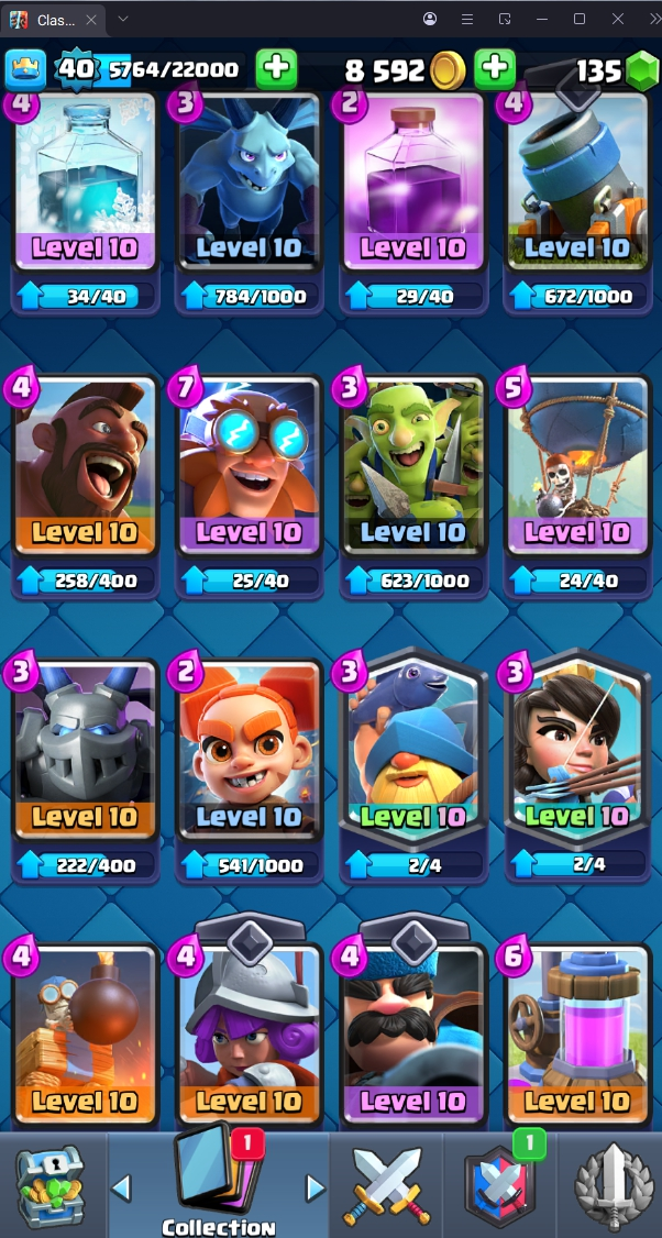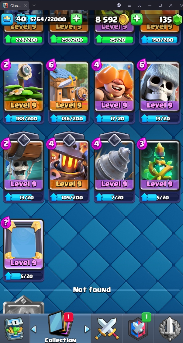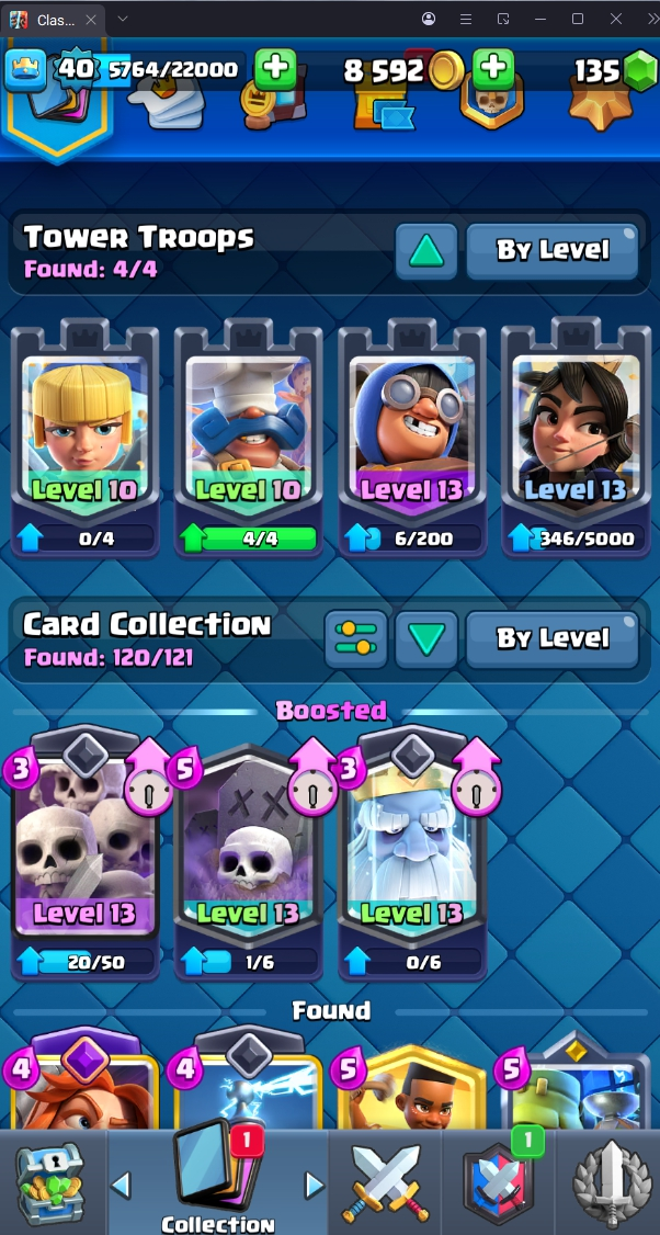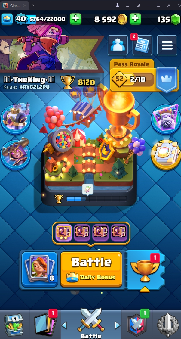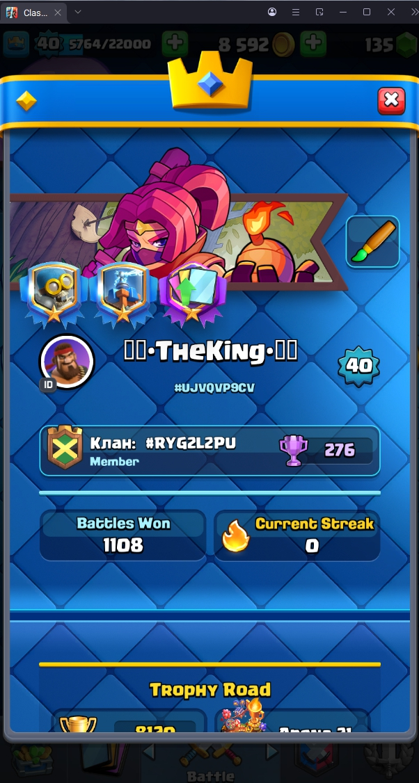 8120 TROPHY 🏆 40 LVL 💯 KT 13 👑 120 CARDS ♦️ 4 MAX CARDS 👑 0 ELITE CARDS 🔮 4 EVO 💯 EMOTE 30 🎭 #UJVQVP9CV ⸱ TAG ACCOUNT ♥️