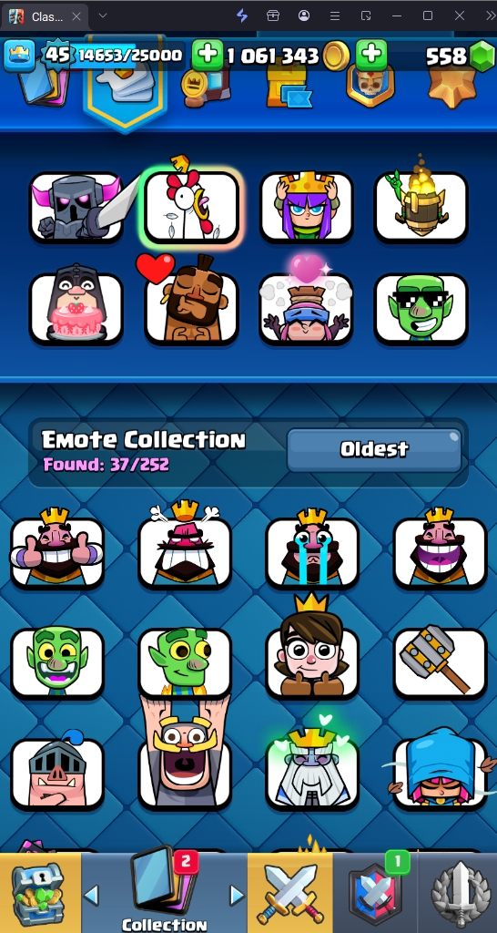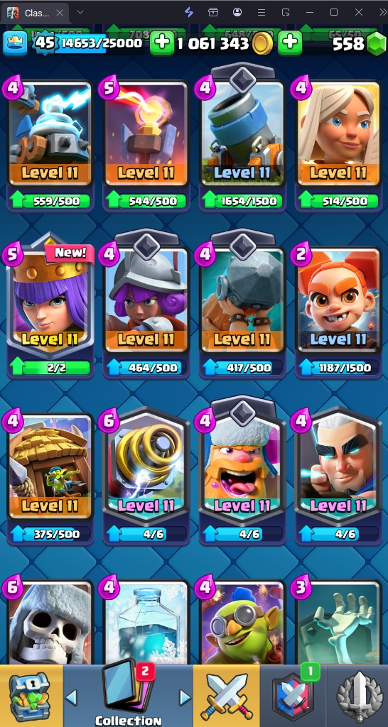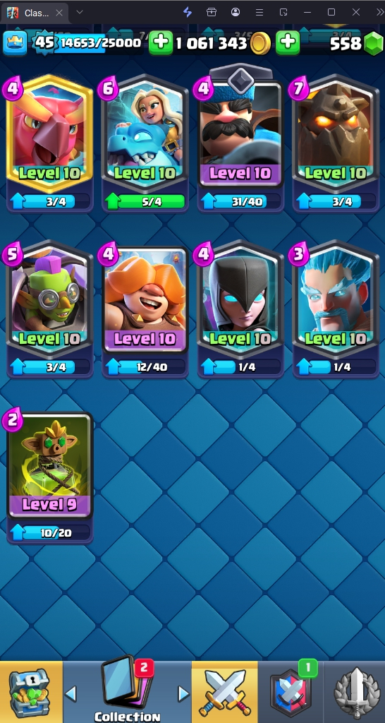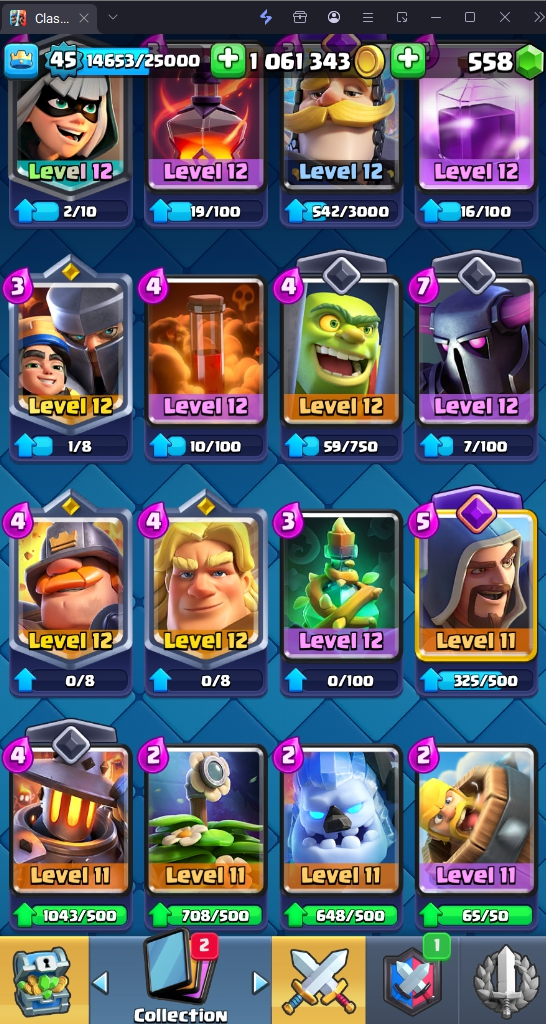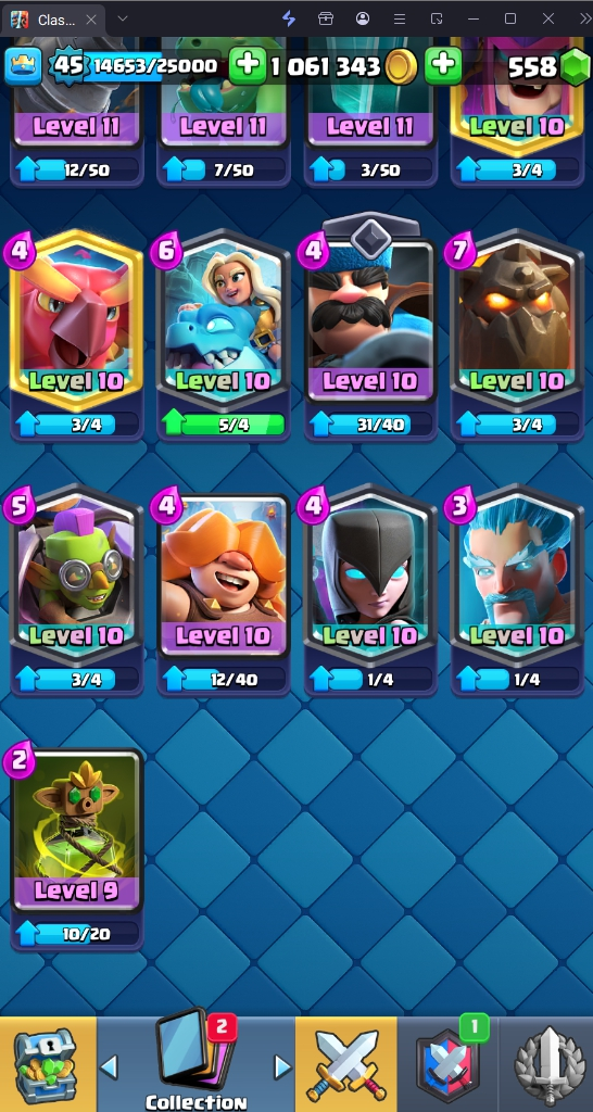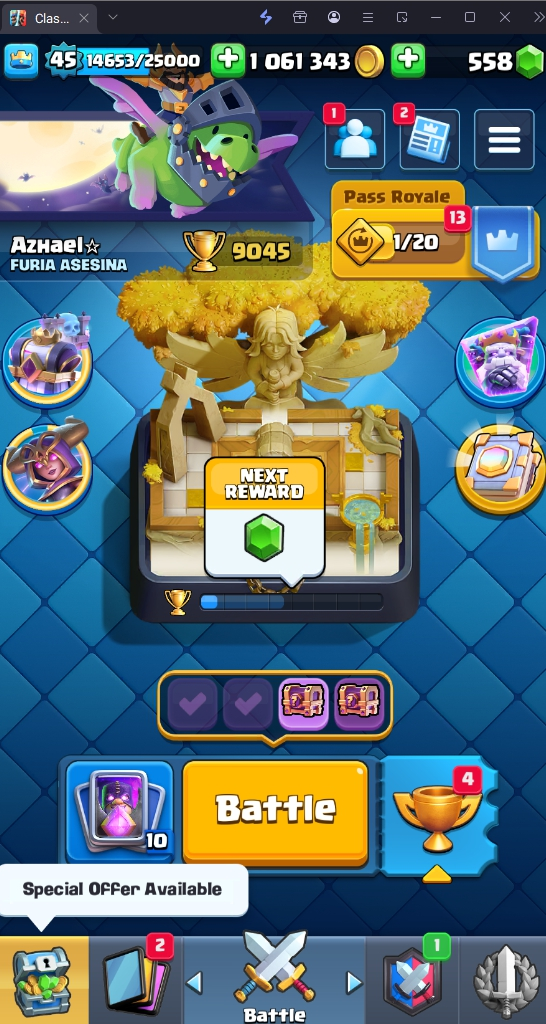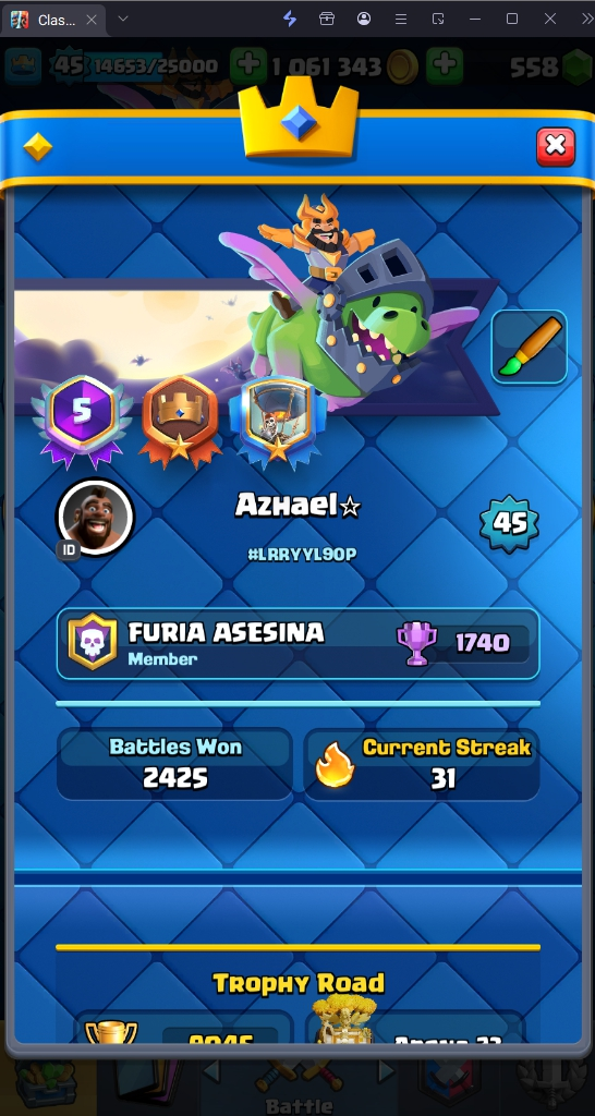 9045 TROPHY 🏆 45 LVL 💯 KT 14 👑 121 CARDS ♦️ 11 MAX CARDS 👑 0 ELITE CARDS 🔮 6 EVO 💯 EMOTE 37 🎭 #LRRYYL90P ⸱ TAG ACCOUNT ♥️