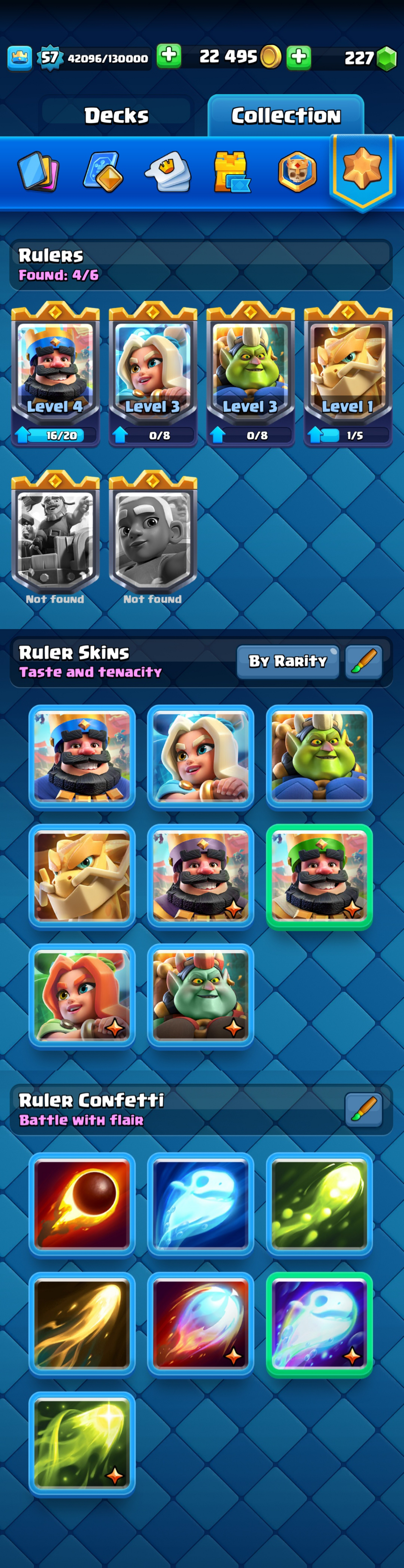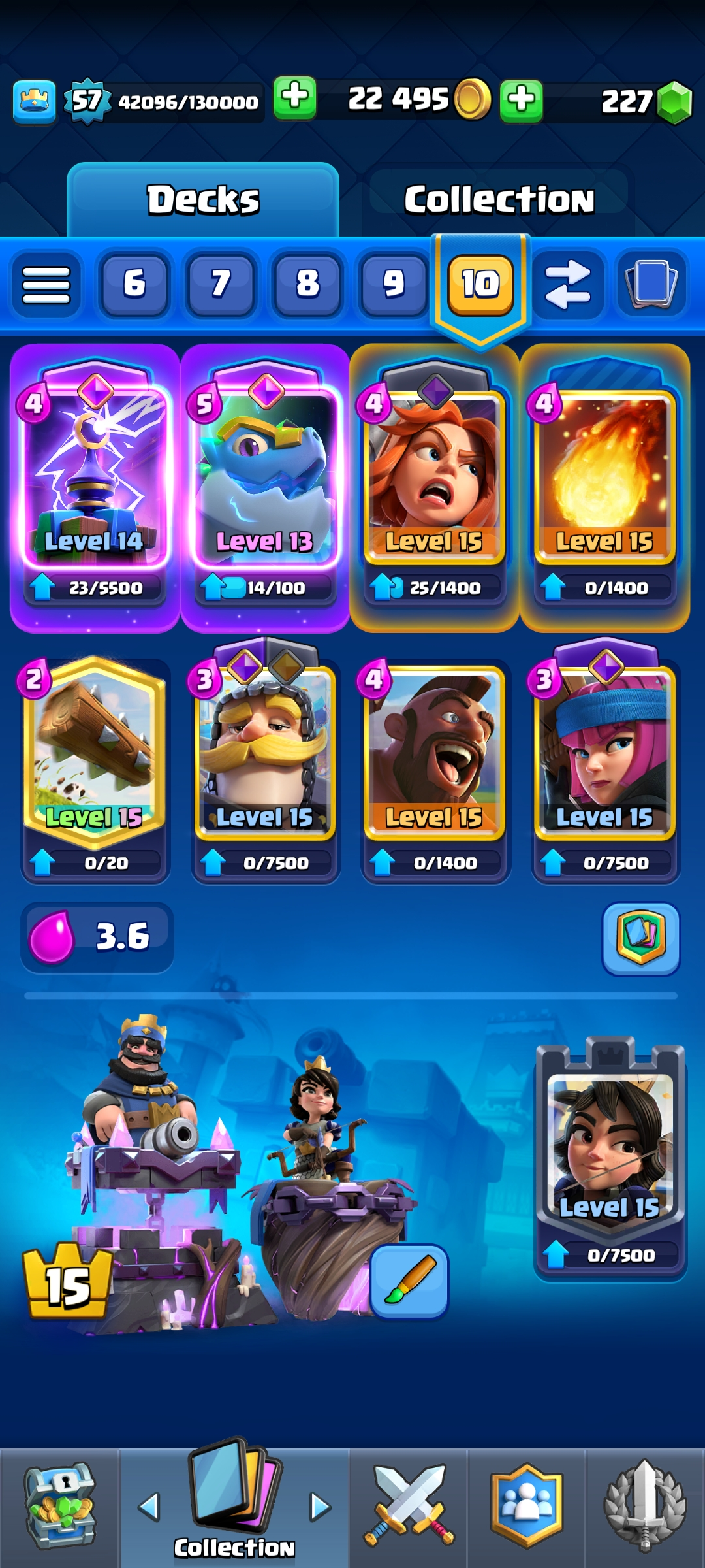 ⭐ KT 15 ⭐ KT Level 15 ⭐ Exp 57 ⭐ 7 Level 15 & 26 Level 14 Cards ⭐ 13 Evolution ⭐ 8 Towerskins ⭐ 98 Emotes ⭐ 10k Trophies ⭐ Namechange 500