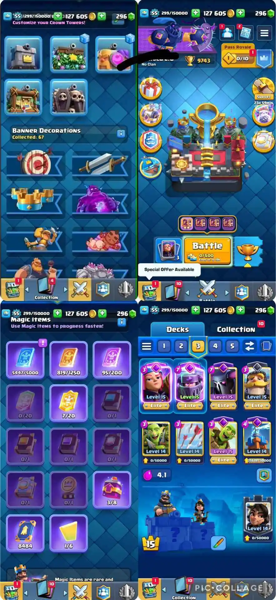 M/🧬 18 Evolutions | ⚡ 8 Elite Cards | 🃏 40 Max Cards | 👑 Level 55 | 🏰 KT 15 | 🏆 9.7K Trophies | 😄 110 Emotes