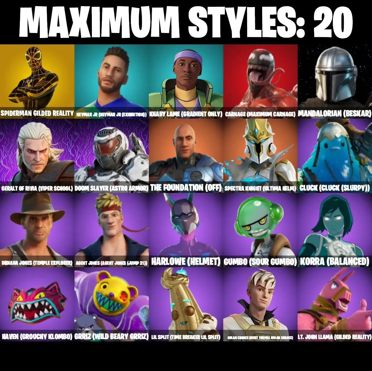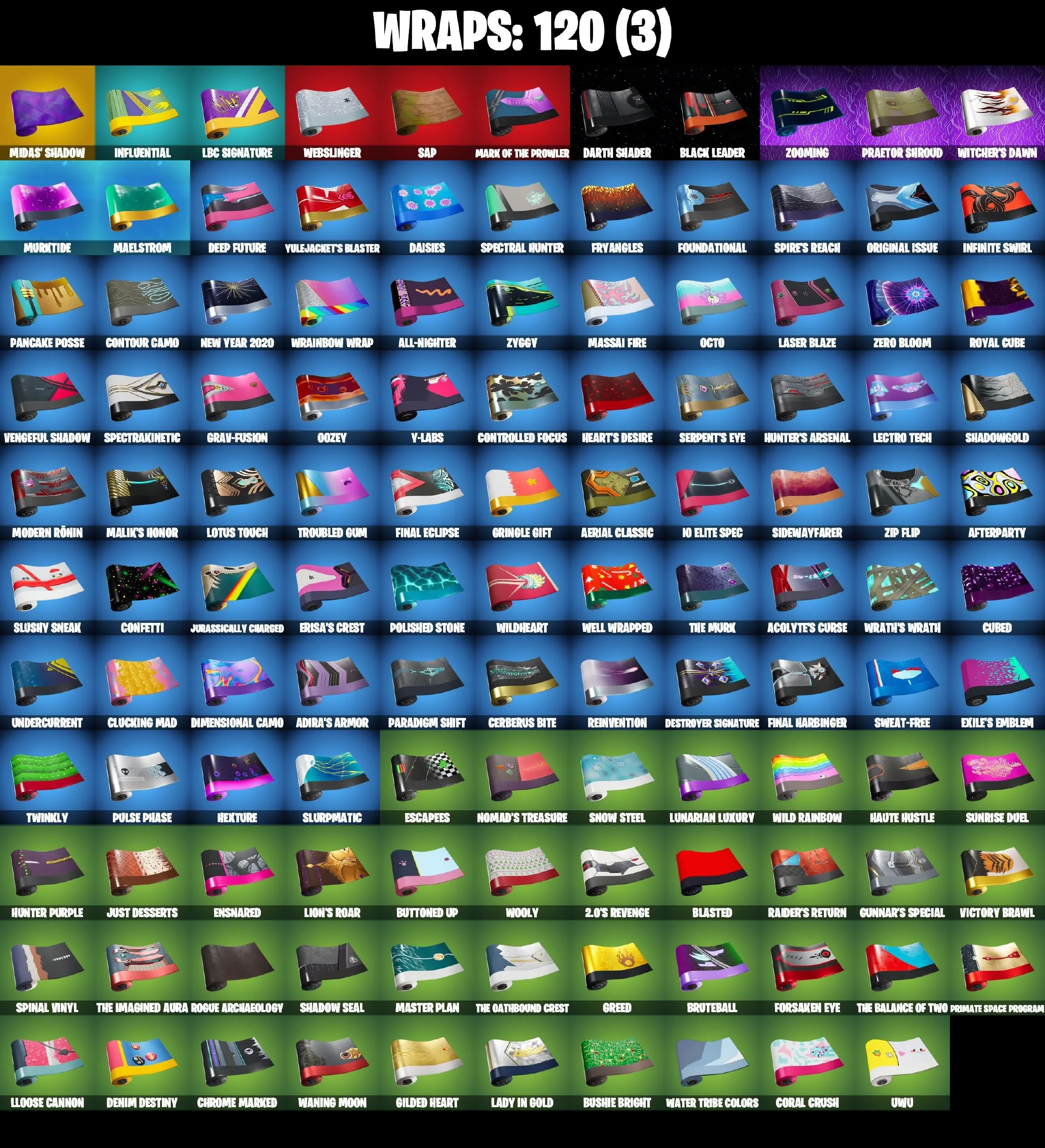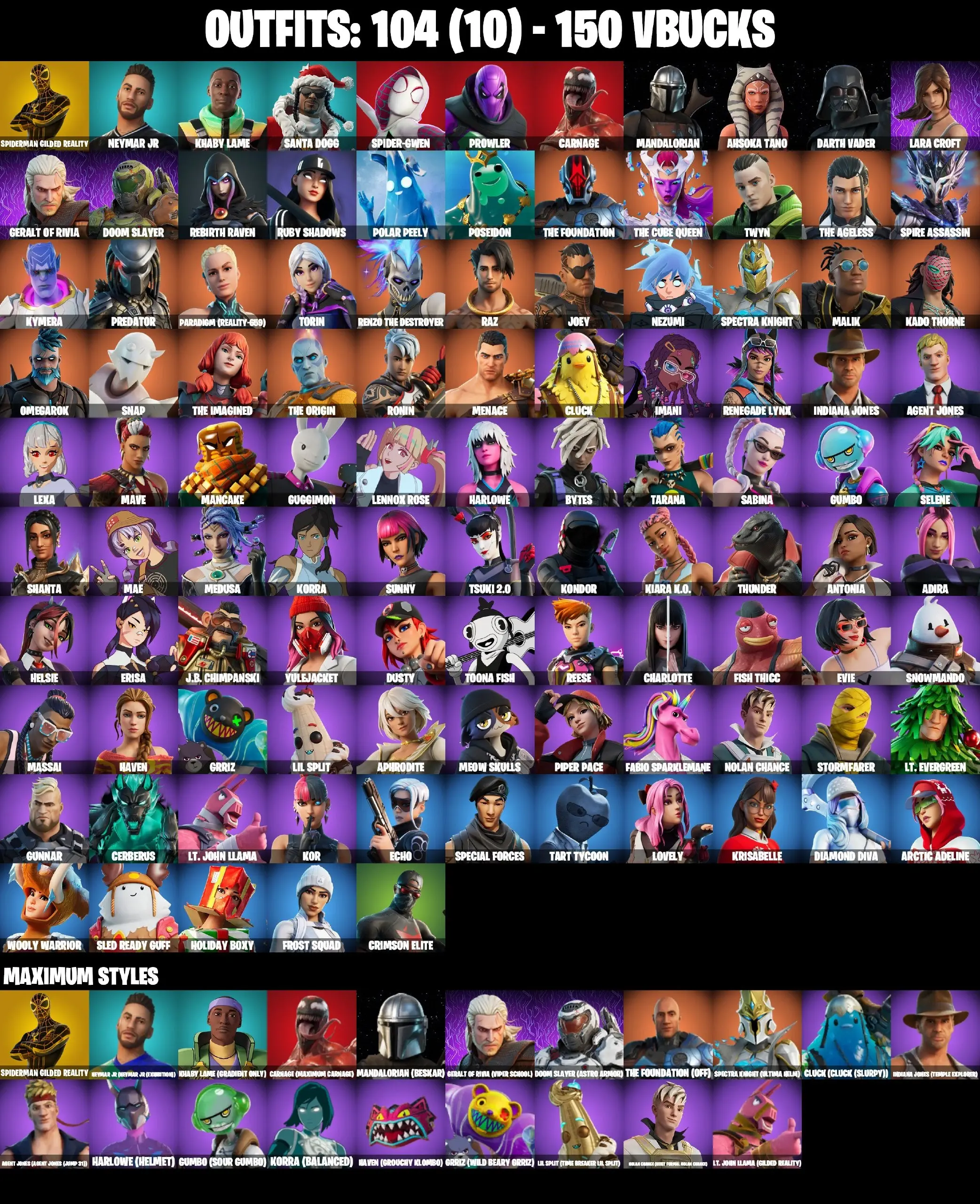 104 SKINS | FULL BESKA MANDALORIAN | LARA CROFT | GILDED SPIDER-MAN | SPIDER-GWEN | AHSOKA TANO | DARTH VADER | ASTROWORLD CYCLONE | PREDATOR | TSUKI 2.0 | HELSIE | CHARLOTTE | EVIE | KOR | MEOW SKULLS | TOONA FISH | CRIMSON ELITE