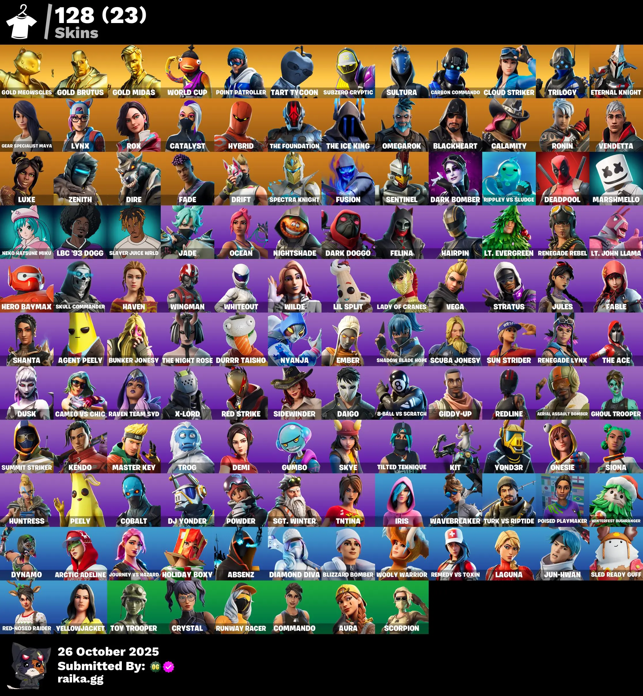 128 skins | Carbon Commando🎃Spectra Knight🎃Gold Meowscles🎃Dire🎃Cloud Striker🎃Subzero Cryptic🎃Rox🎃Tart Tycoon🎃Sultura🎃The Ice King🎃Catalyst🎃Gold Midas🎃Trilogy🎃Lynx🎃Point Patroller🎃Calamity🎃Gold Brutus🎃The Foundation🎃Omegarok D5208