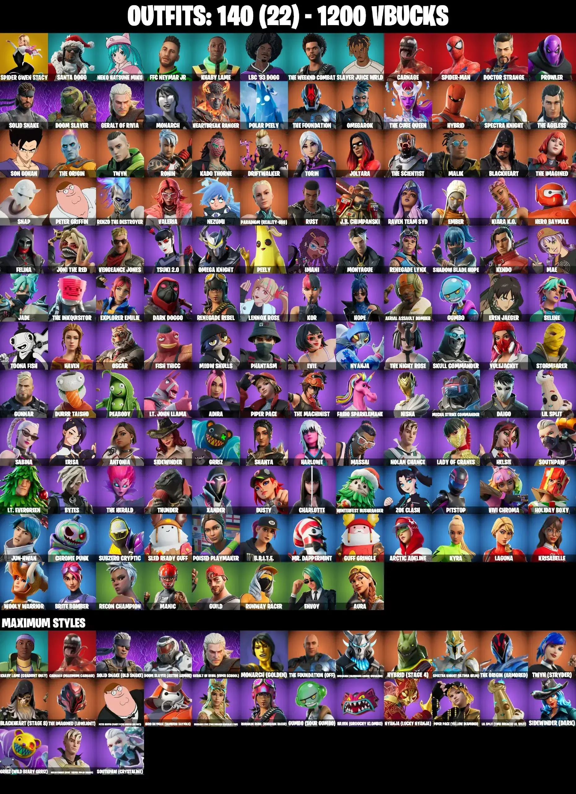140 SKINS | JOLTARA | SPIDER-GWEN STACY | SPIDER-MAN | JABBA SWITCHWAY | GET GRIDDY | STAR WAND | SON GOHAN | EREN JAEGER | JONI THE RED | TSUKI 2.0 | KOR | EVIE | CHARLOTTE | DURRR TAISHO | LADY OF CRANES | HELSIE | AURA | ICE BR