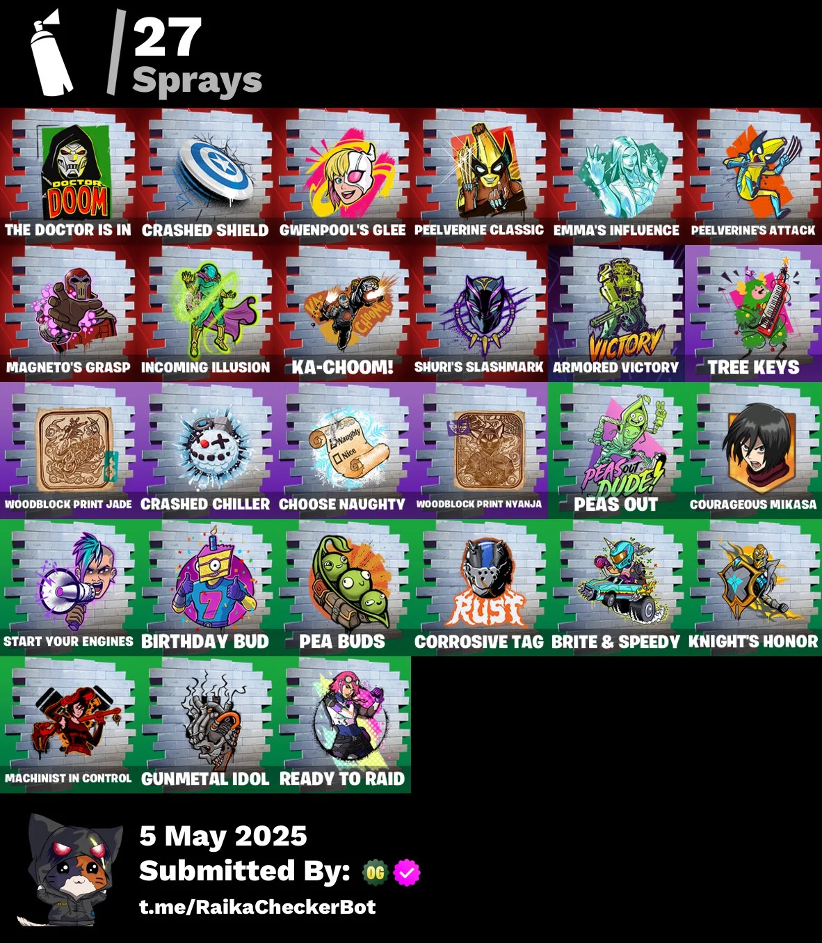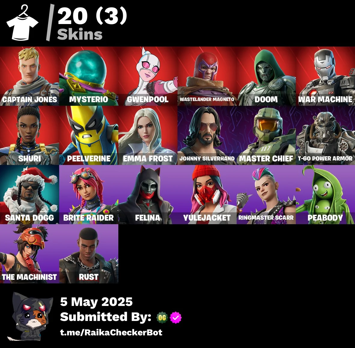 20 skins | Master Chief | Captain Jones | Mysterio | Gwenpool | Wastelander Magneto | Doom | War Machine | Shuri | Peelverine | Emma Frost | 500 VB | Nai@1