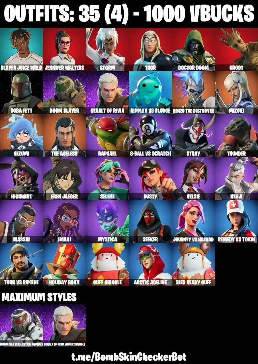 35 SKINS | BOBA FETT | SNOWFLAKE | EREN JAEGER | HELSIE | RAPHAEL | IMANI | MIZUKI | RENZO THE DESTROYER | CAN PLAY ON PSN,XBOX,PC,NINTENDO,MOBILE | 1000 VBUCKS | FULL EMAIL ACCESS