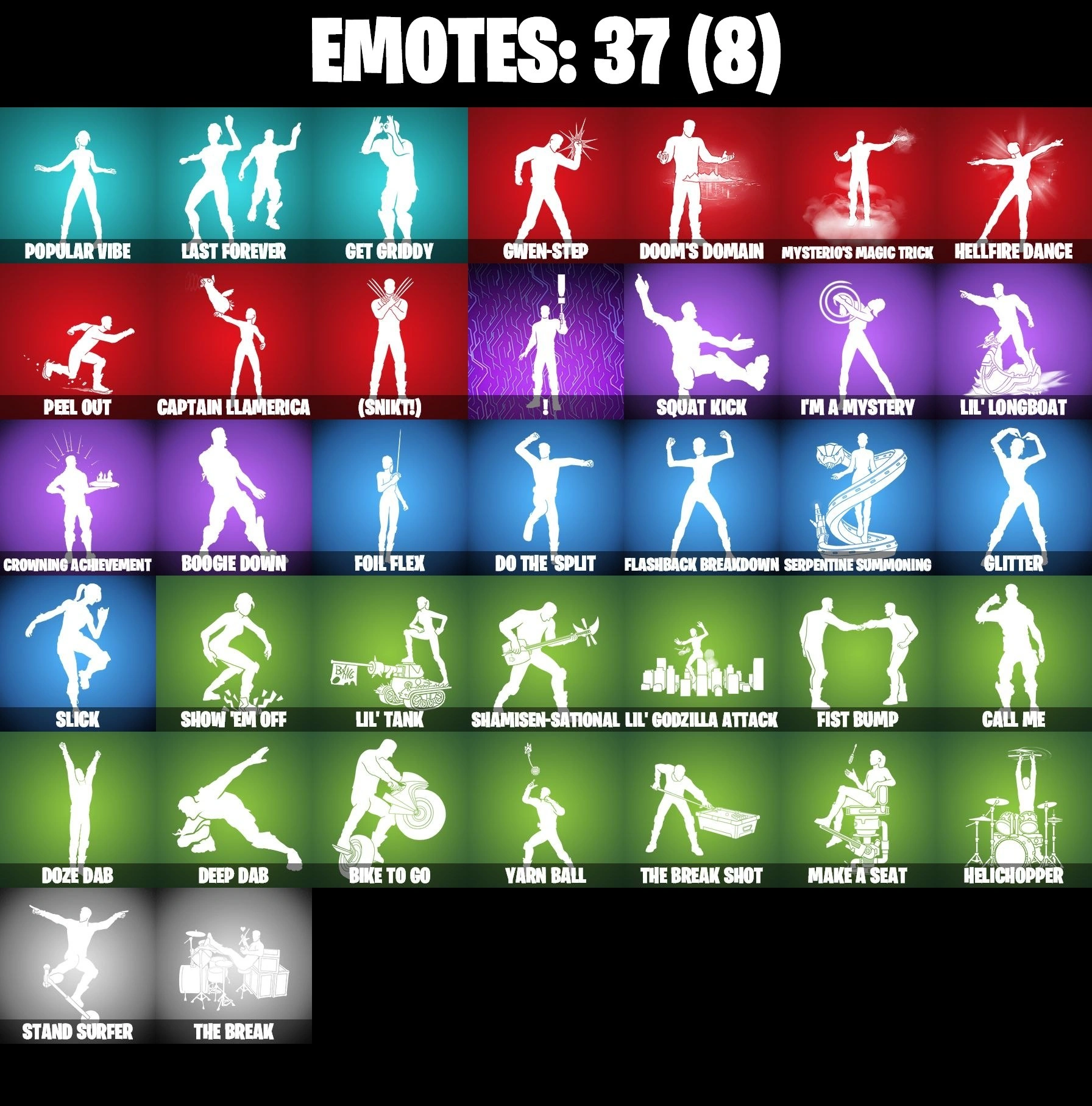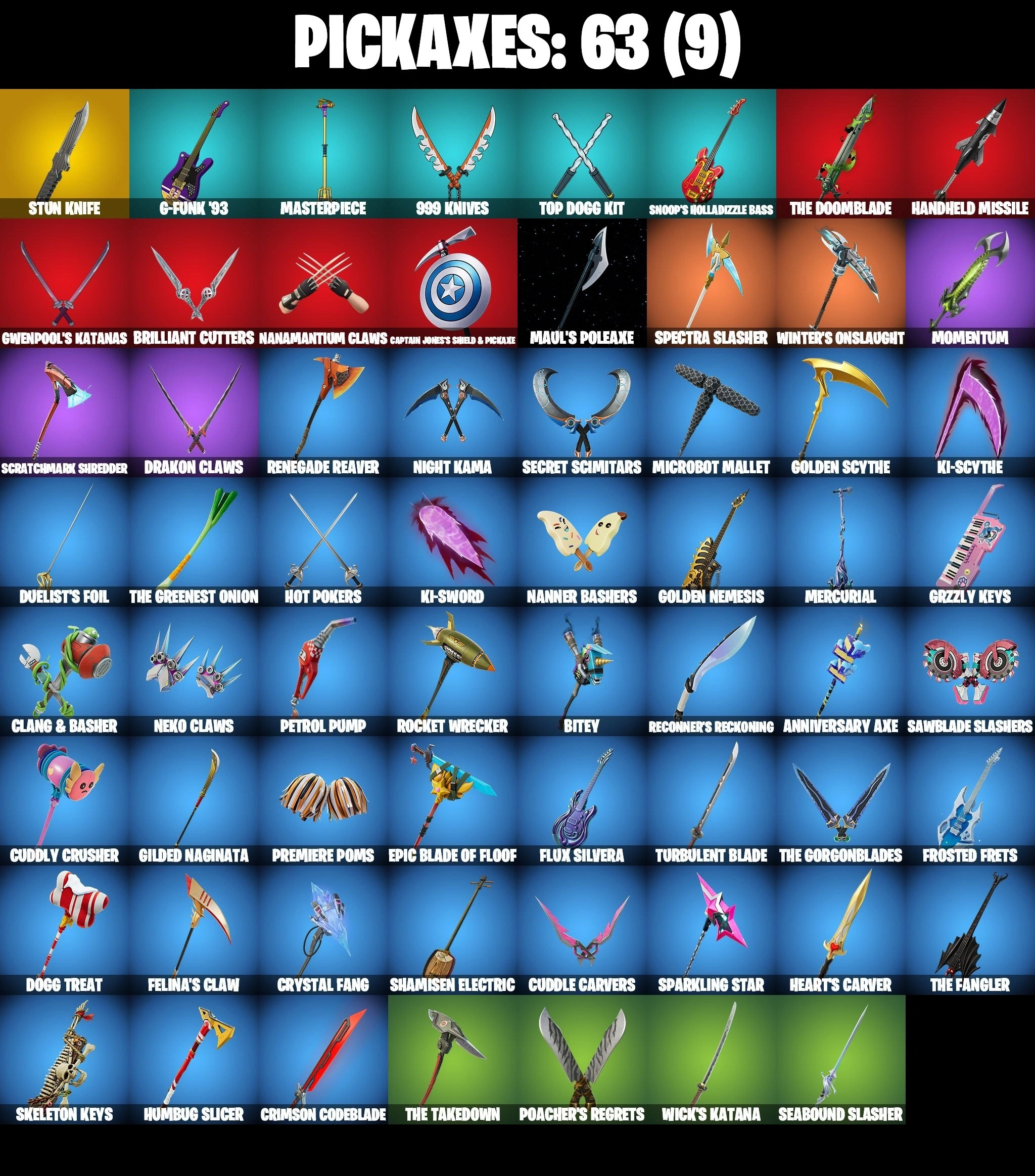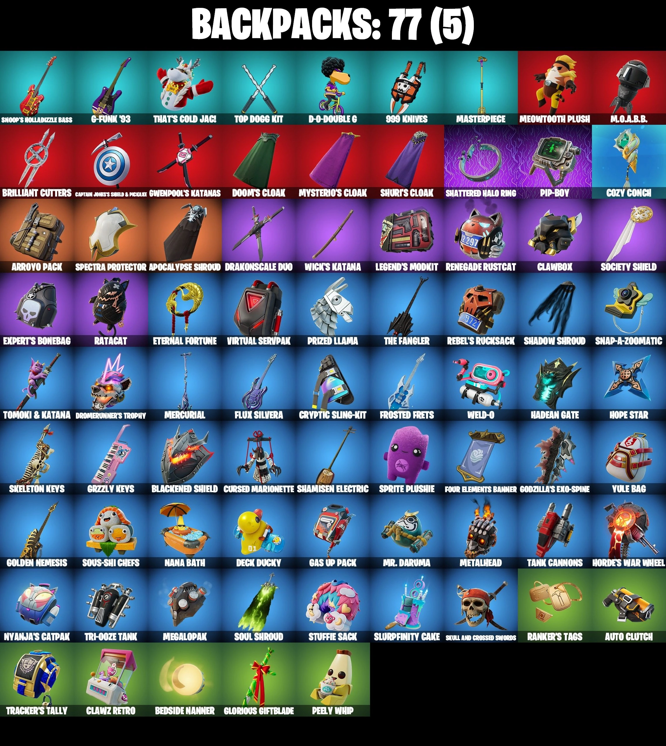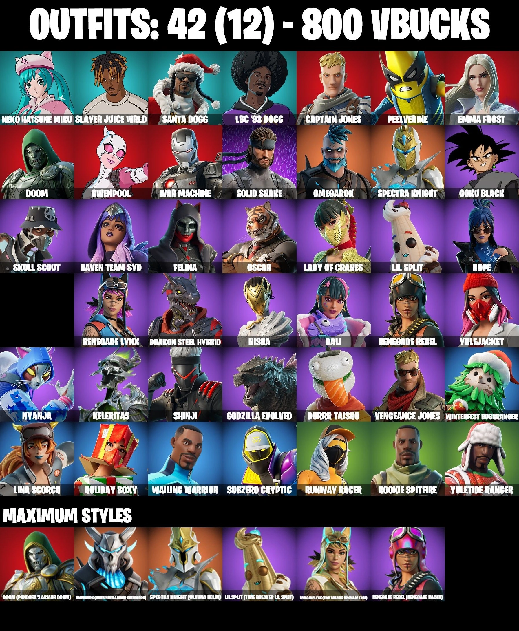42 SKINS ⸱ GWENPOOL ⸱ KELERITAS ⸱ SOLID SNAKE ⸱ NEKO HATSUNE MIKU ⸱ GOKU BLACK ⸱ DALI ⸱ SKULL SCOUT ⸱ WAR MACHINE ⸱ PEELVERINE ⸱ OMEGAROK ⸱ OSCAR ⸱ HOPE ⸱ SHINJI ⸱ WAILING WARRIOR ⸱ LINA SCORCH ⸱ SUBZERO CRYPTIC ⸱ GET GRIDDY ⸱ POP