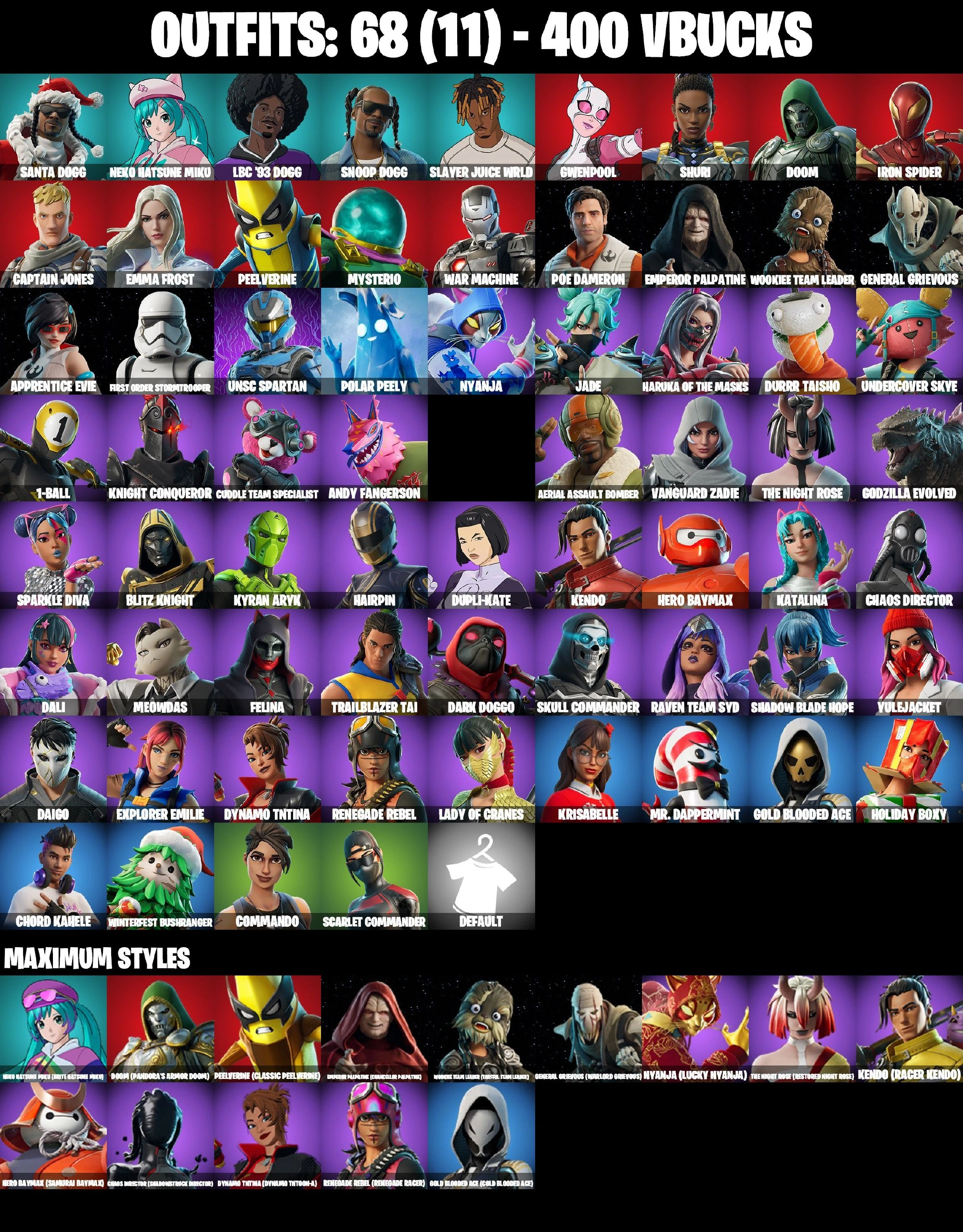 68 SKINS | GO MUFASA | JABBA SWITCHWAY | GET GRIDDY | EMPEROR PLPATINE MAX | WOOKIE TEAM LEADER MAX | GENERAL GRIEVOUS MAX | IRON SPIDER | POE DAMERON | APPRENTICE EVIE | FIRST ORDER STROMTROOPER | NEKO HATSUNE MIKU MAX | LADY OF