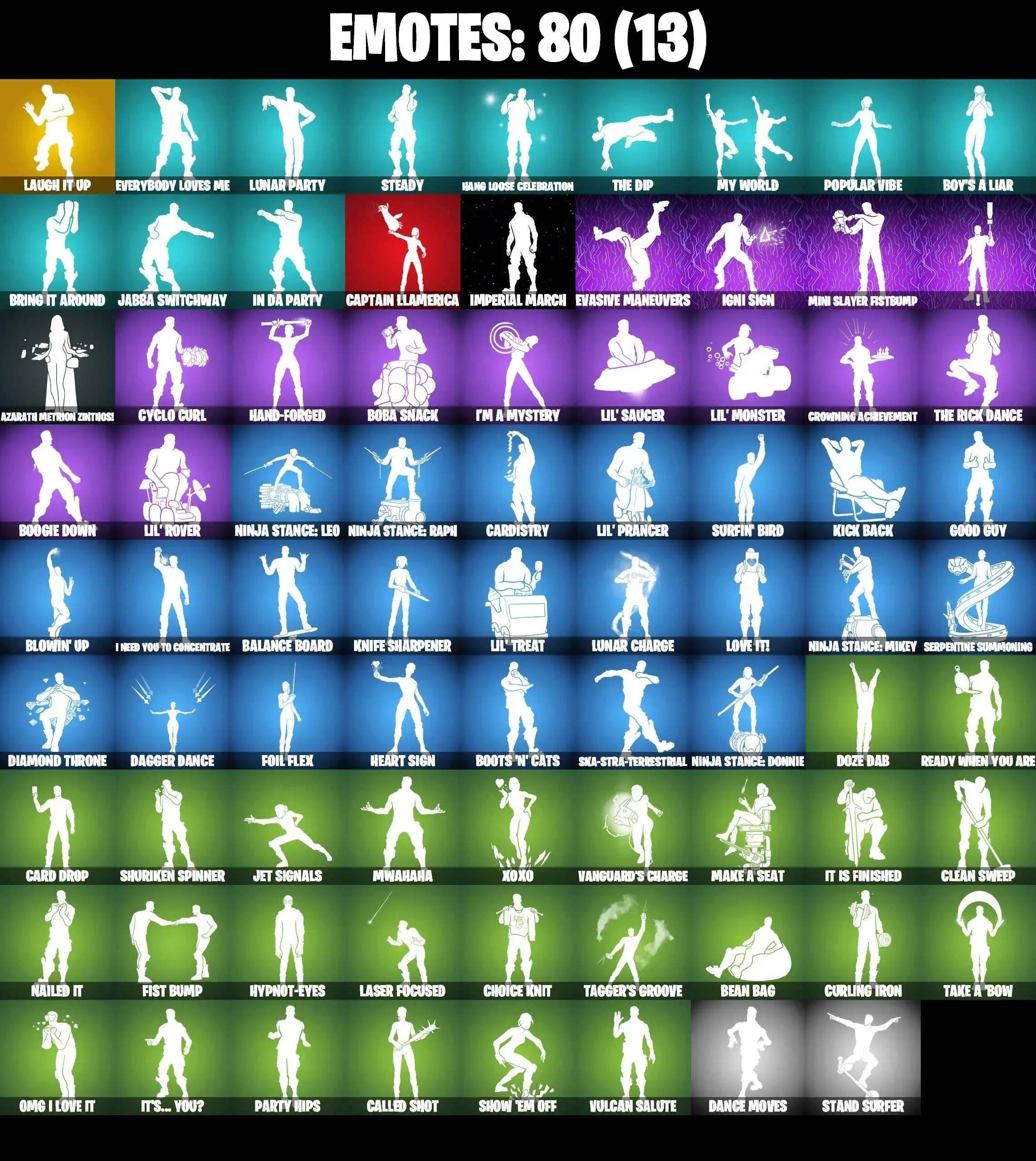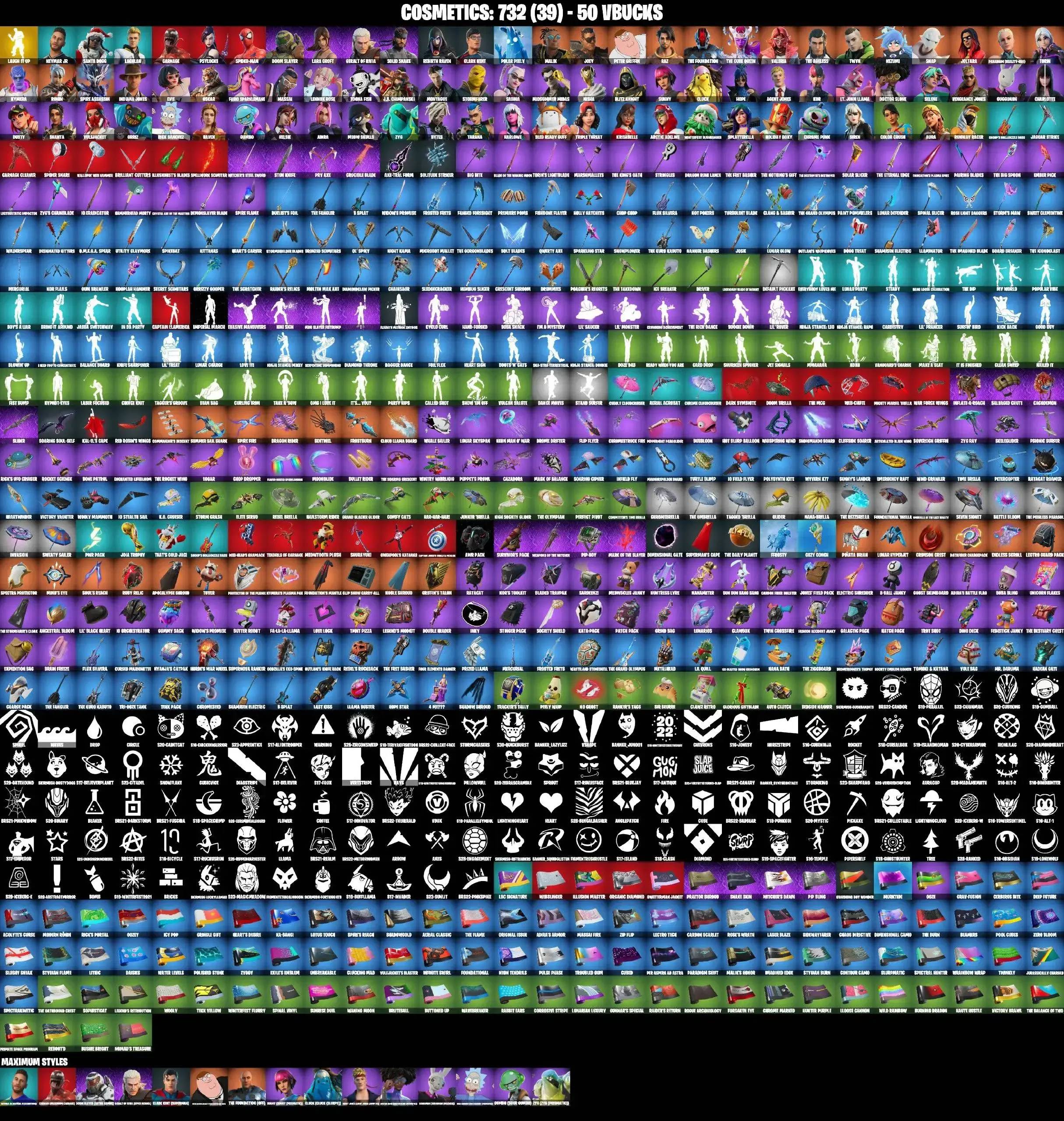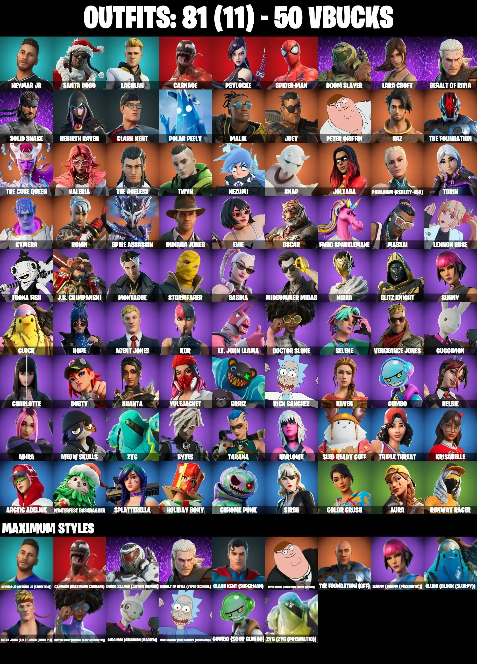 81 SKINS | JOLTARA | LARA CROFT | SPIDER-MAN | JABBA SWITCHWAY | LAUGH IT UP | MIDSUMMER MIDAS | AURA | HELSIE | CHARLOTTE | KOR | EVIE | MEOW SKULLS | ICE BREAKER | CAN PLAY ON PSN,XBOX,PC,NINTENDO,MOBILE | 50 VBUCKS | FULL EM