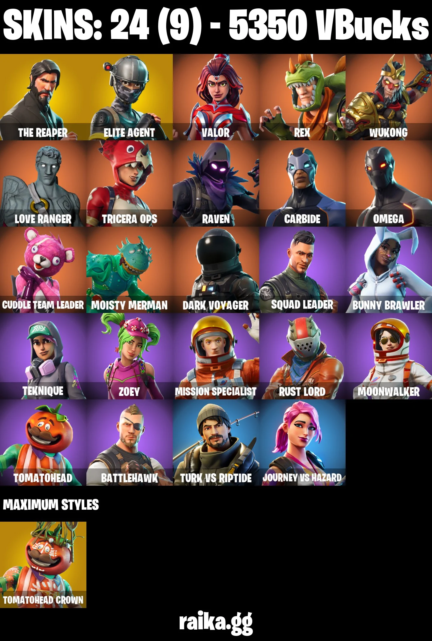 ⭐ Inactive for 4 years | PC/PSN/XBOX | 24 skins | 5350 vbuck | The Reaper | Elite Agent | Valor | Rex | Wukong | Love Ranger | Tricera Ops | Raven | Carbide | Omega | Cuddle Team Leader | 5350 VB