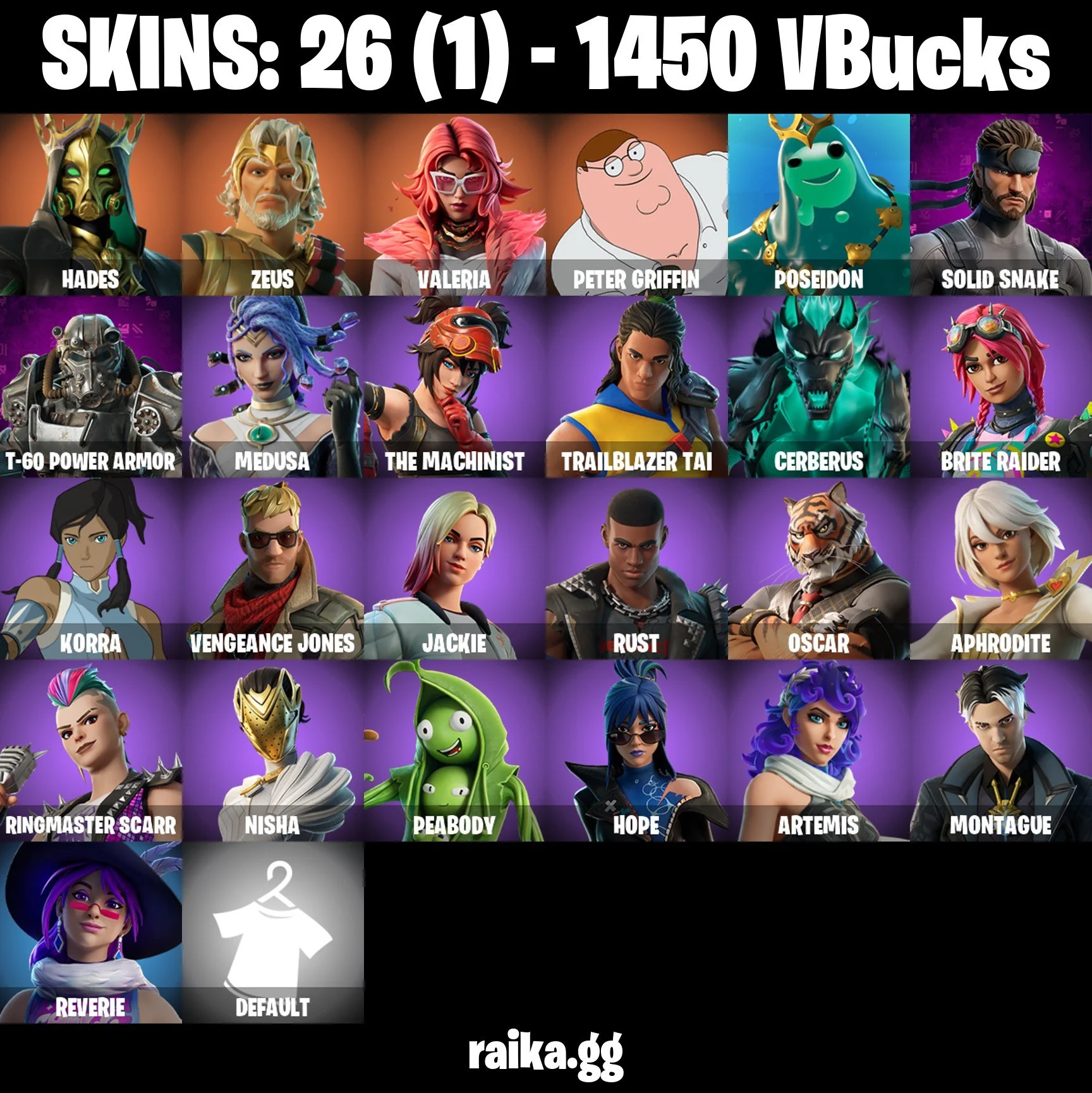[PC] 26 Skins 🎮 Hades 🔥 Zeus ⚡ Valeria 🗡️ Peter Griffin 🍗 Poseidon 🌊 Solid Snake 🐍 T-60 Power Armor 🤖 Medusa 🐍 The Machinist ⚙️ Trailblazer Tai 🏔️ OGmFN1004