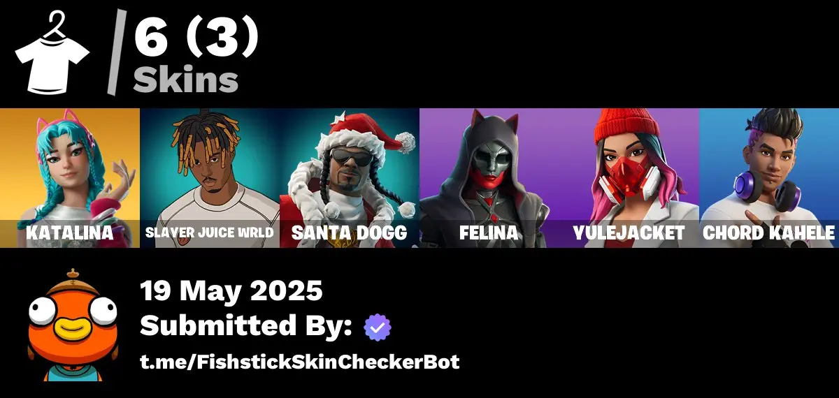 [PC] 6 Skins | Katalina | Slayer Juice WRLD | Santa Dogg | Felina | Yulejacket | Chord Kahele | Twin Blasters | Meowtooth Plush | 500 VB | FN30
