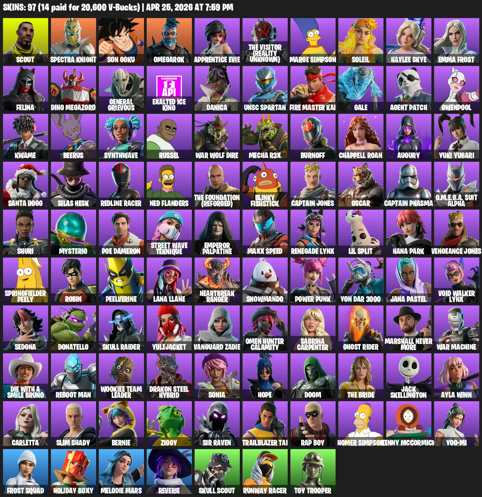 [PC] | 97 skins | Mako | Scout | Spectra Knight | Son Goku | Omegarok | Apprentice Evie | The Visitor (Reality Unknown) | Marge Simpson | #SYZ4133