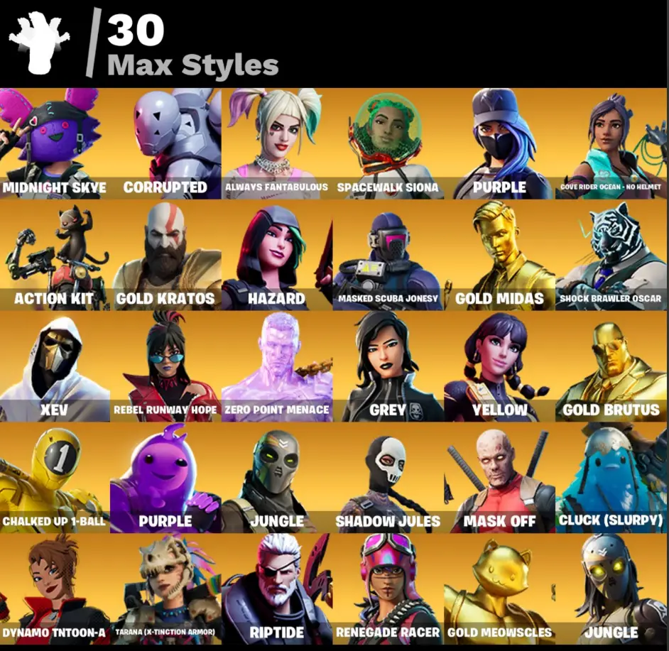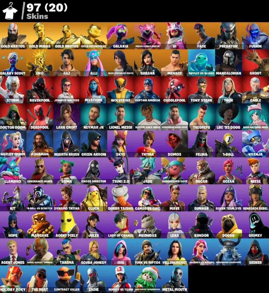 (PC PSN XBOX) 97 skins | LEVIATHAN AXE / Gold Kratos | LARA CROFT / HARLEY QUINN / Gold Midas | Gold Brutus | Gold Meowscles | Galaxia | Mecha Cuddle Master | Vi | Fade | Predator | Fusion