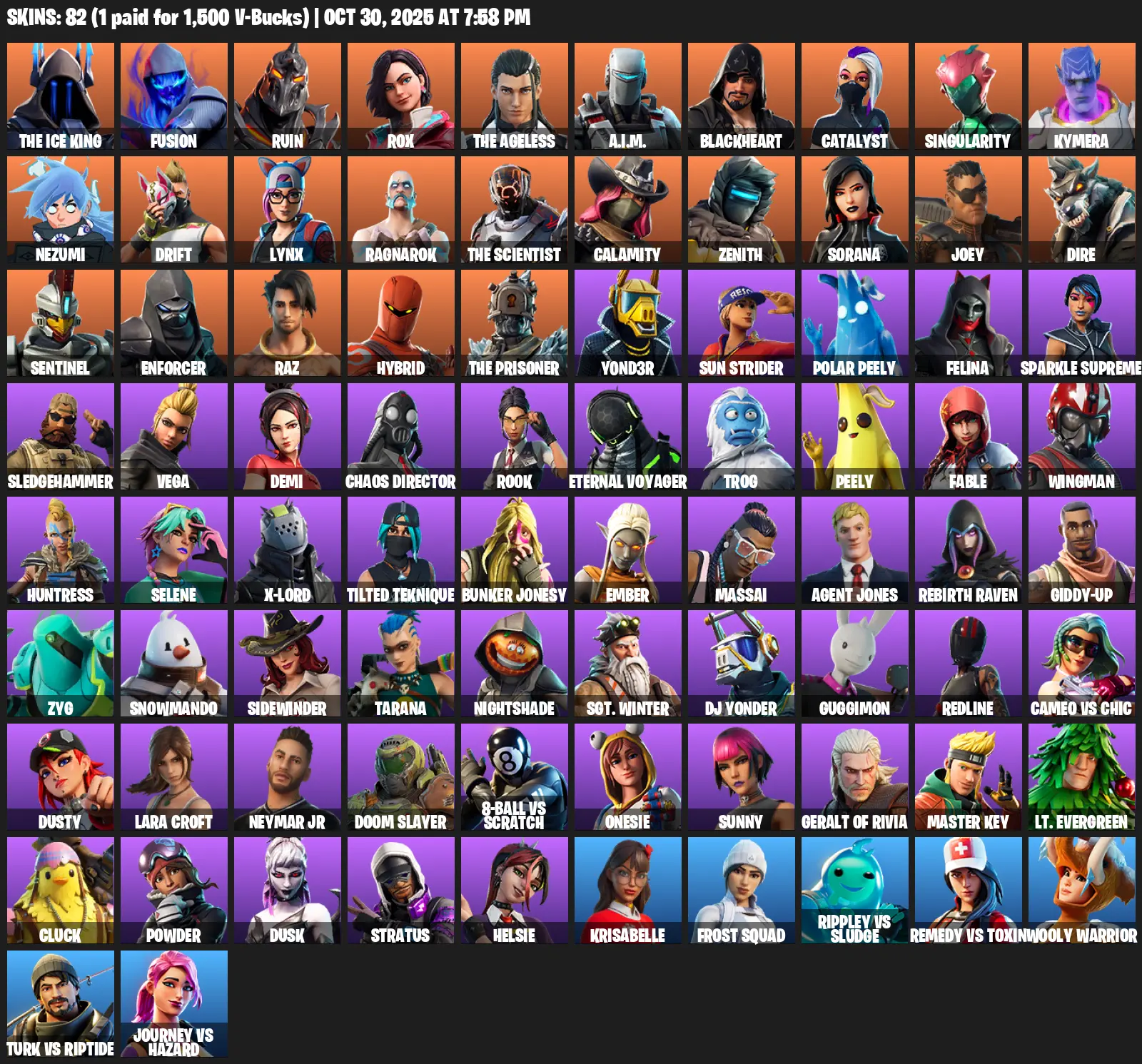[PC/PSN] | 82 skins | 900 V-bucks | Lara Croft | The Ice King | Fusion | Ruin | Rox | The Ageless | A.I.M. | Blackheart | Catalyst | #ILU1951 | #MBFN