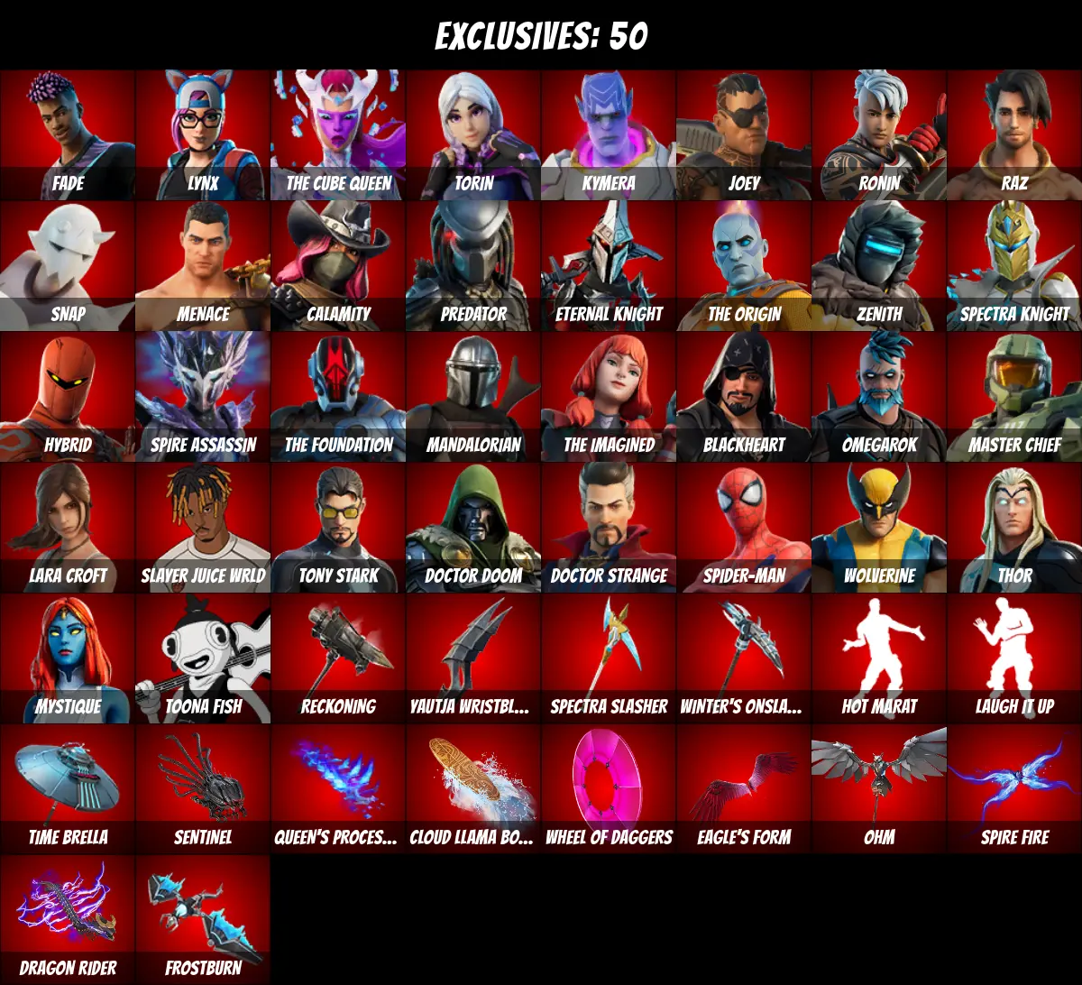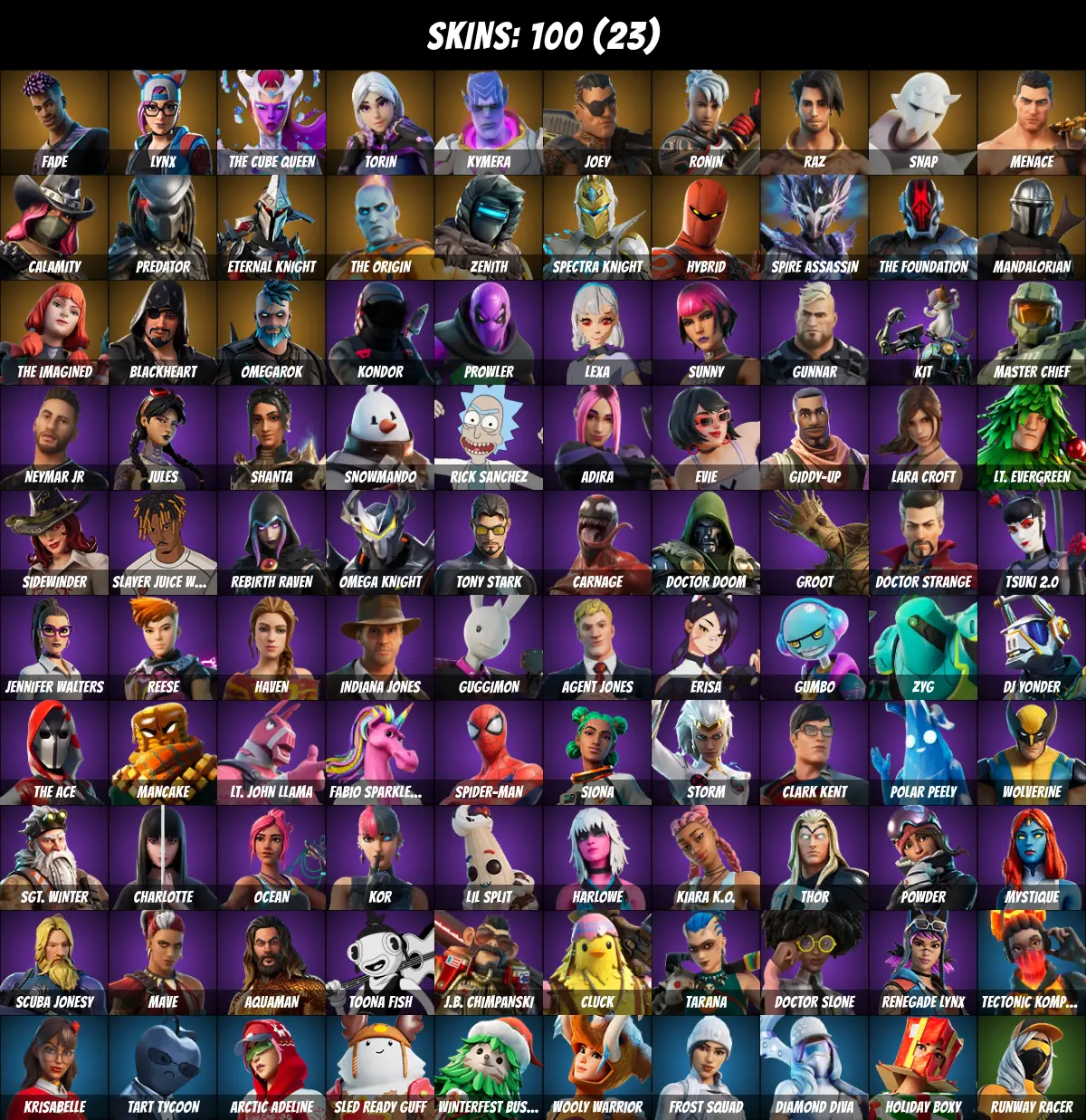 โกPC/PSN/XBOXโก 100 skins ๐ Rick Sanchez ๐ Kor ๐ Tony Stark ๐ Lara Croft ๐ Mandalorian ๐ Master Chief ๐ Lynx ๐ Jules ๐ Calamity ๐ Spider-Man ๐ Toona Fish ๐ Thor ๐ Laugh It Up ๐ Snap ๐ Doctor Strange ๐ Wolverine ๐ Mystique ๐ Fade ๐ 1200 V-Bucks ๐