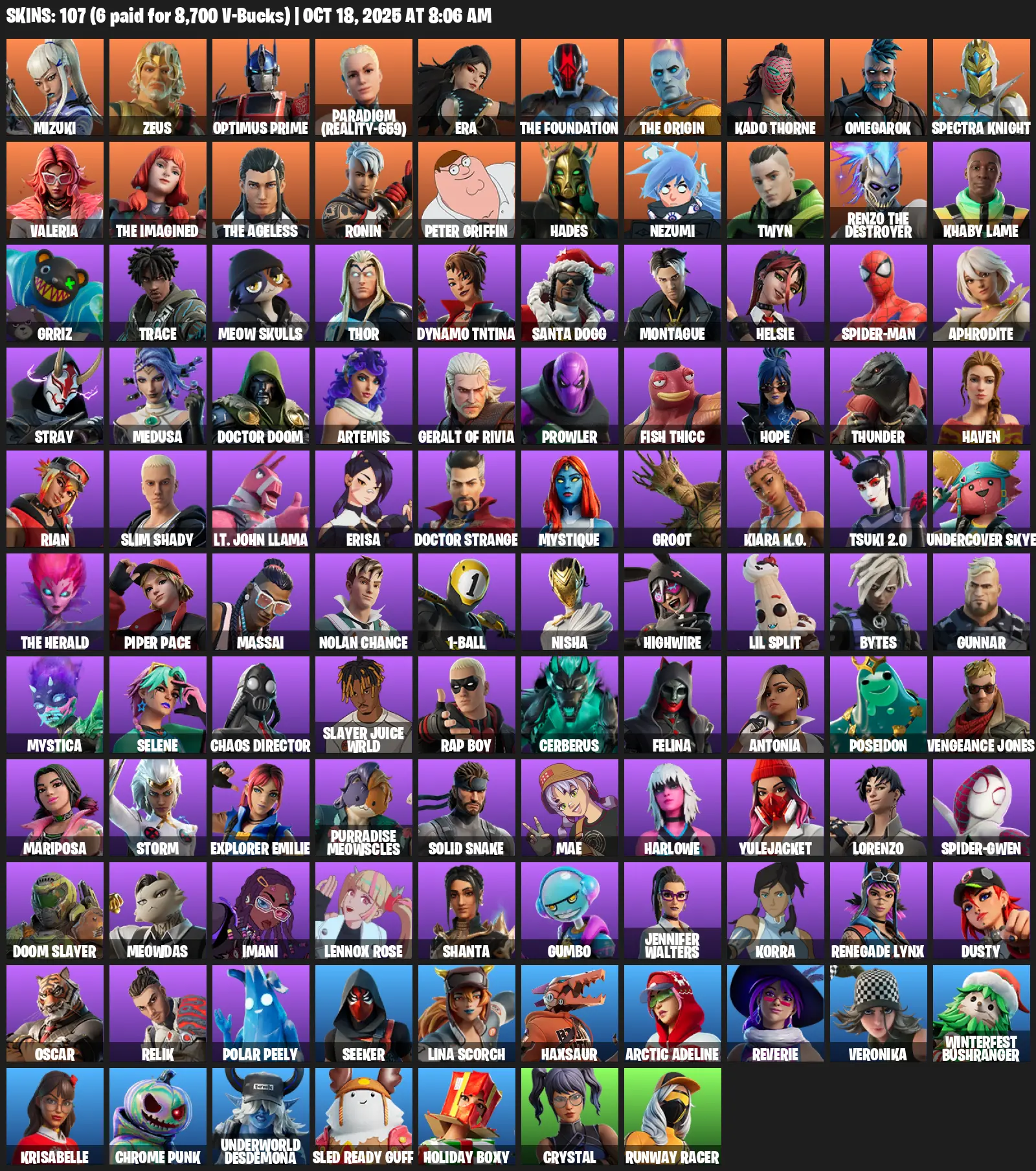 π¨ [PC/PSN/XBOX] π 107 skins | Mizuki , Zeus , Optimus Prime , Paradigm (Reality-659) , Era , The Foundation , The Origin , Kado Thorne , OmegaRok | π 500 VBUCKS | βοΈ Changeable Email Now