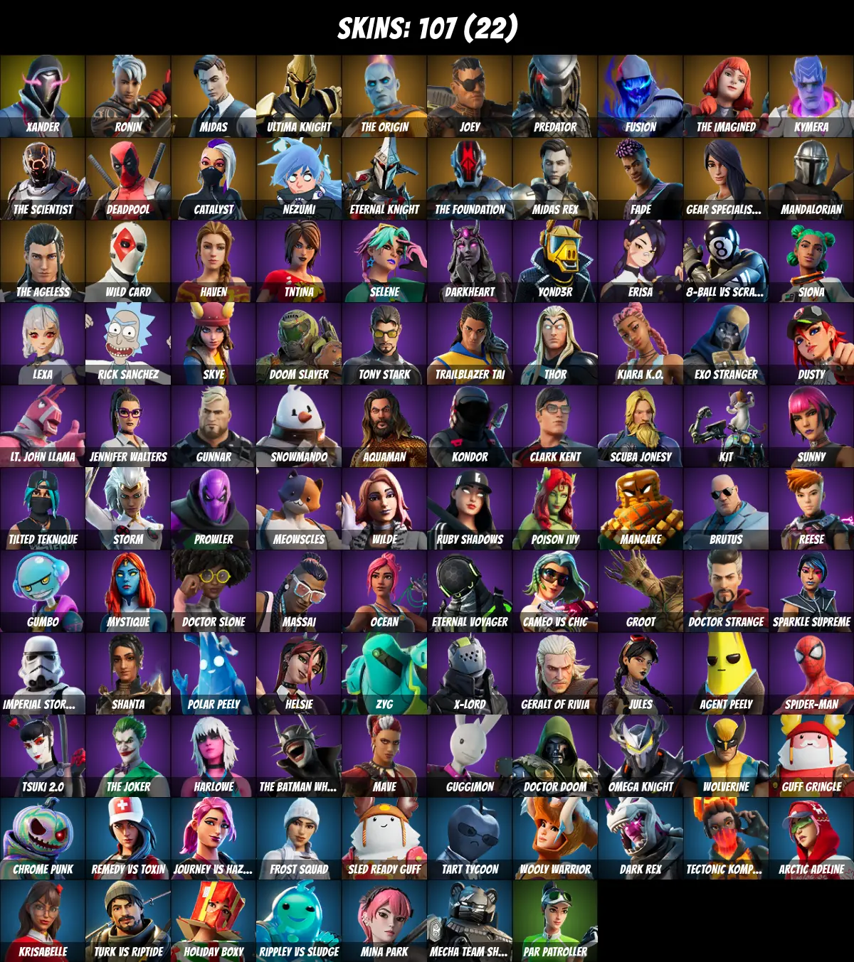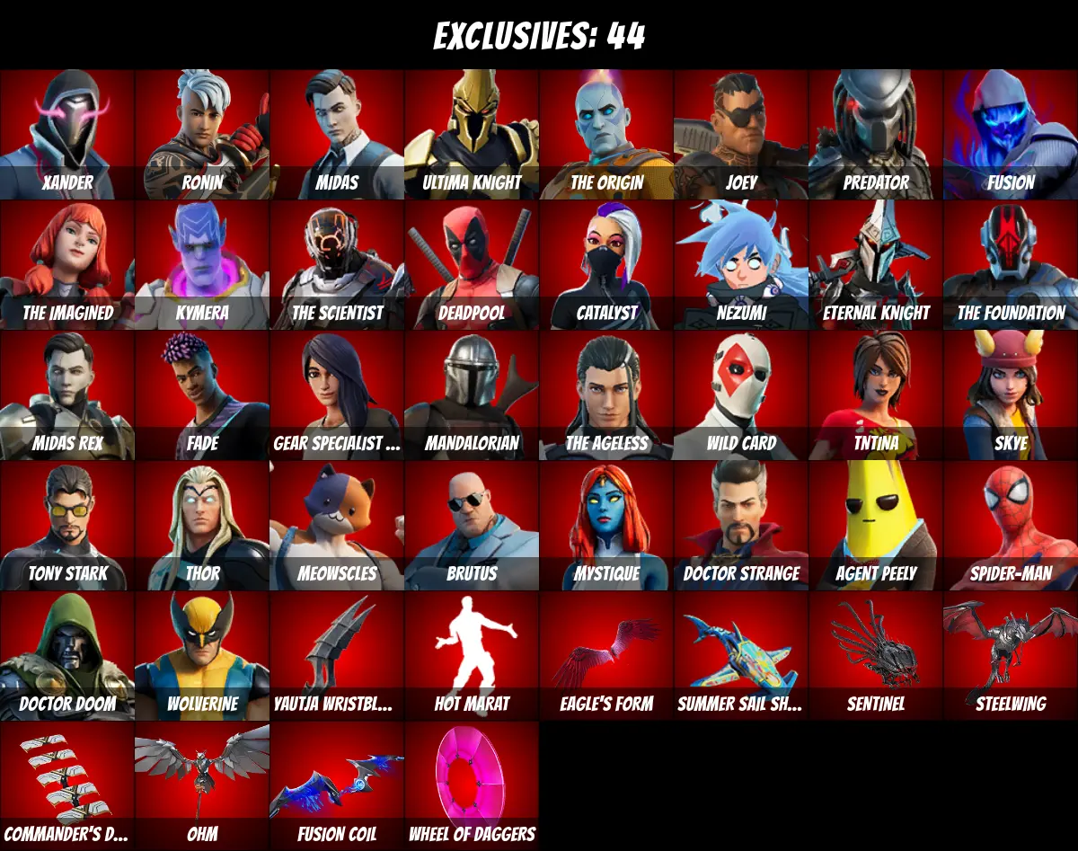 โกPC/PSN/XBOXโก 107 skins ๐ Rick Sanchez ๐ Deadpool ๐ Tony Stark ๐ Midas ๐ Mandalorian ๐ Jules ๐ Agent Peely ๐ Spider-Man ๐ The Ageless ๐ Catalyst ๐ Ultima Knight ๐ Meowscles ๐ Thor ๐ TNTina ๐ Brutus ๐ Doctor Strange ๐ Xander ๐ Ronin ๐ 300 V-Bucks ๐