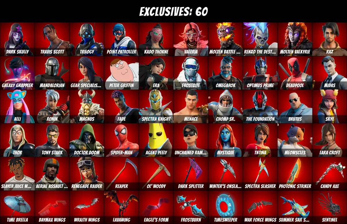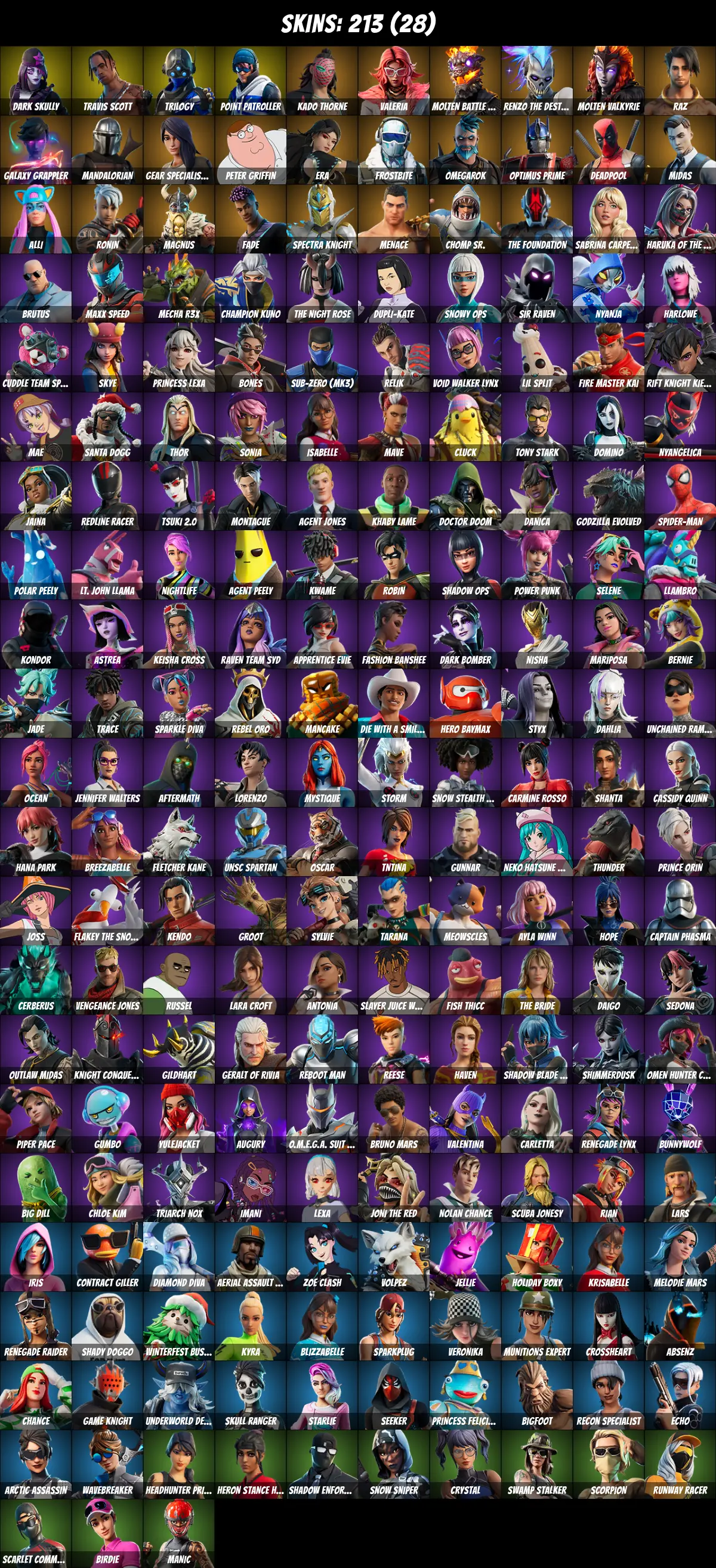 โกPC/PSN/XBOXโก 213 skins ๐ Travis Scott ๐ Renegade Raider ๐ Aerial Assault Trooper ๐ Dark Skully ๐ Unchained Ramirez ๐ Candy Axe ๐ Deadpool ๐ Tony Stark ๐ Lara Croft ๐ Midas ๐ Mandalorian ๐ Agent Peely ๐ Spider-Man ๐ Trilogy ๐ 8200 V-Bucks ๐