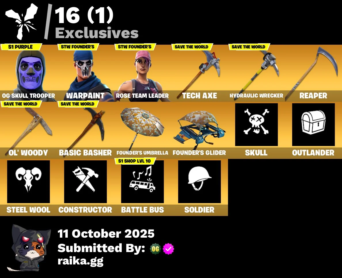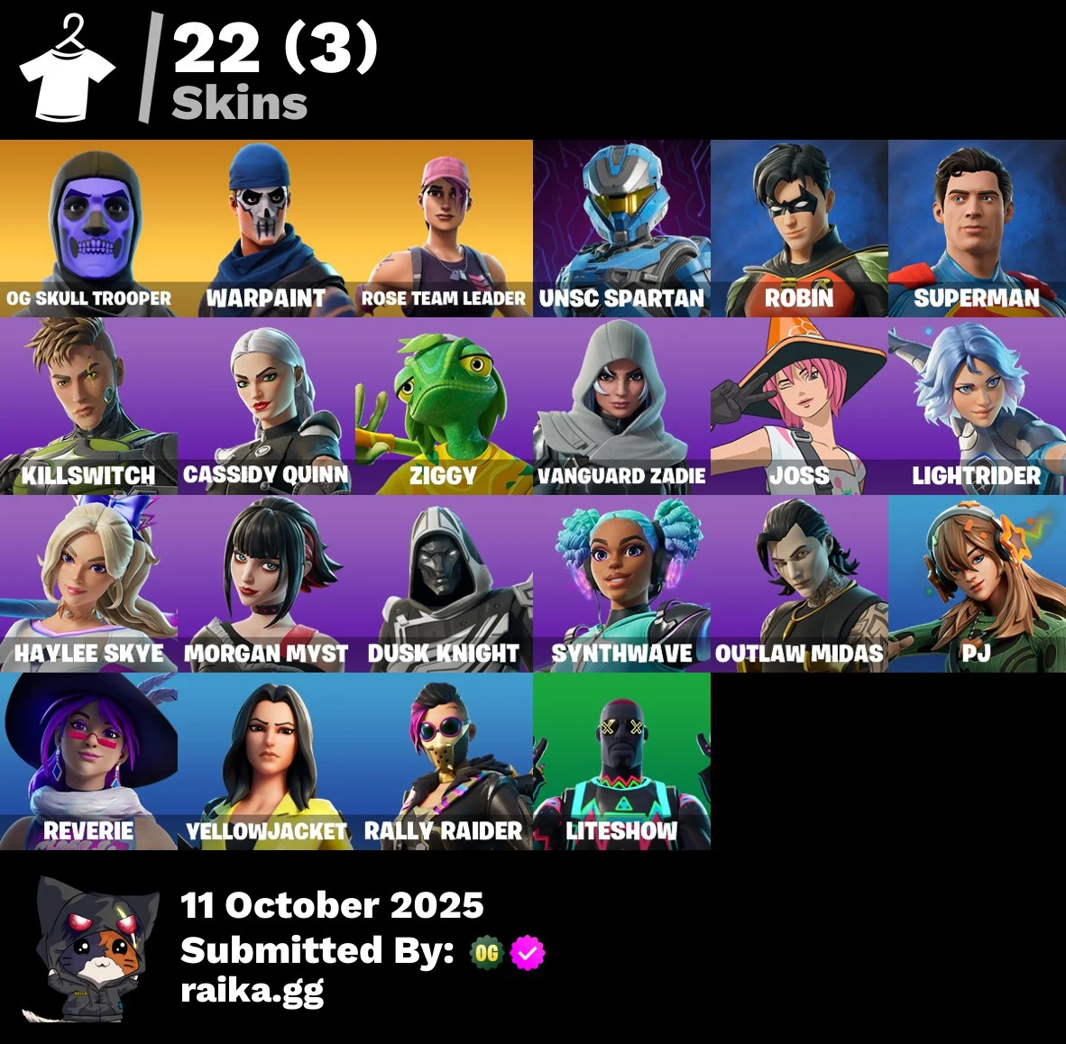 [PC/PSN/XBOX] 22 skins | OG STW | Og Skull Trooper | UNSC Spartan | Robin | Superman | Killswitch | Cassidy Quinn | Ziggy | Vanguard Zadie | Joss | Lightrider | 100 VB