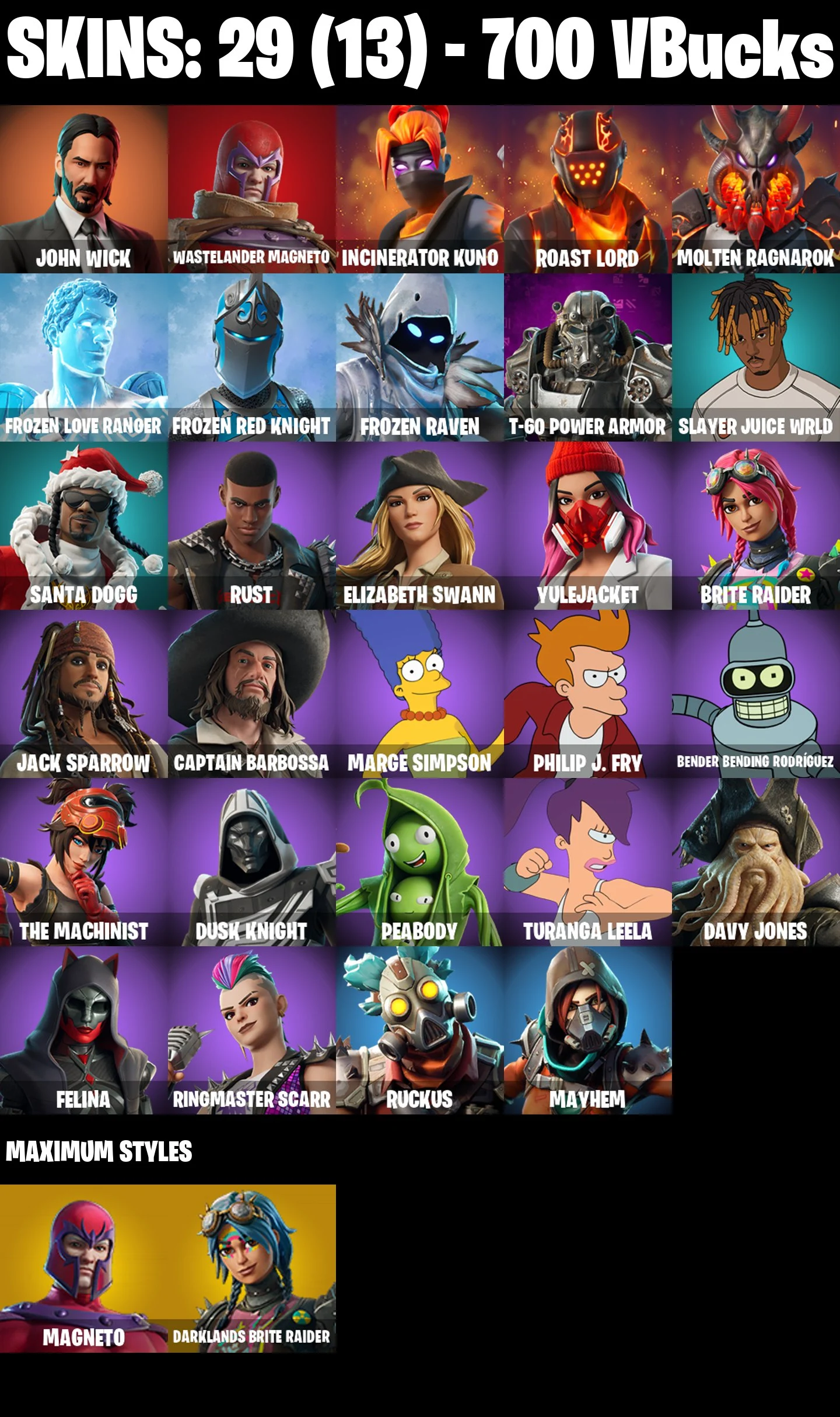 [PC/PSN/XBOX] 29 skins | John Wick | Wastelander Magneto | Incinerator Kuno | Roast Lord | Molten Ragnarok | Frozen Love Ranger | Frozen Red Knight | 700 VB