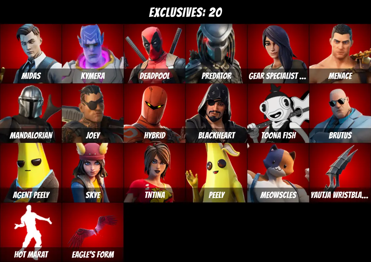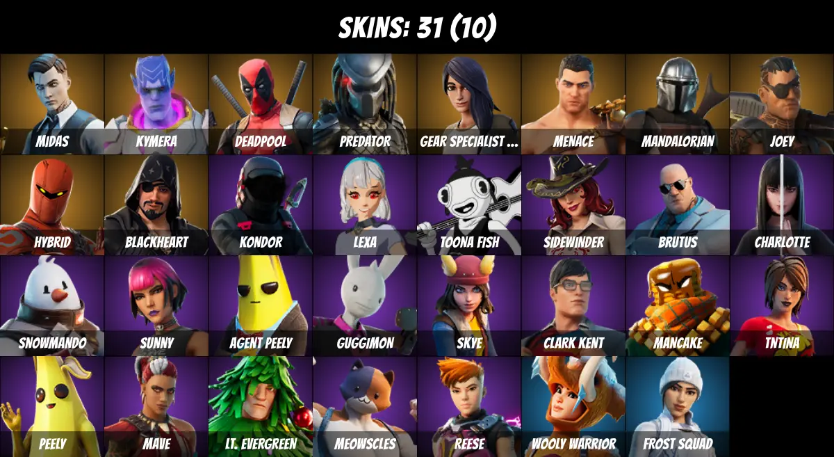 ⚡PC/PSN/XBOX⚡ 31 skins 💎 Deadpool 💎 Midas 💎 Mandalorian 💎 Peely 💎 Agent Peely 💎 Toona Fish 💎 Meowscles 💎 TNTina 💎 Brutus 💎 Skye 💎 Blackheart 💎 Menace 💎 Hybrid 💎 Kymera 💎 Predator 💎 Joey 💎 Gear Specialist Maya 💎 Kondor 💎 Lexa 💎 Sidewinder 💎 1000 V-Bucks 💎