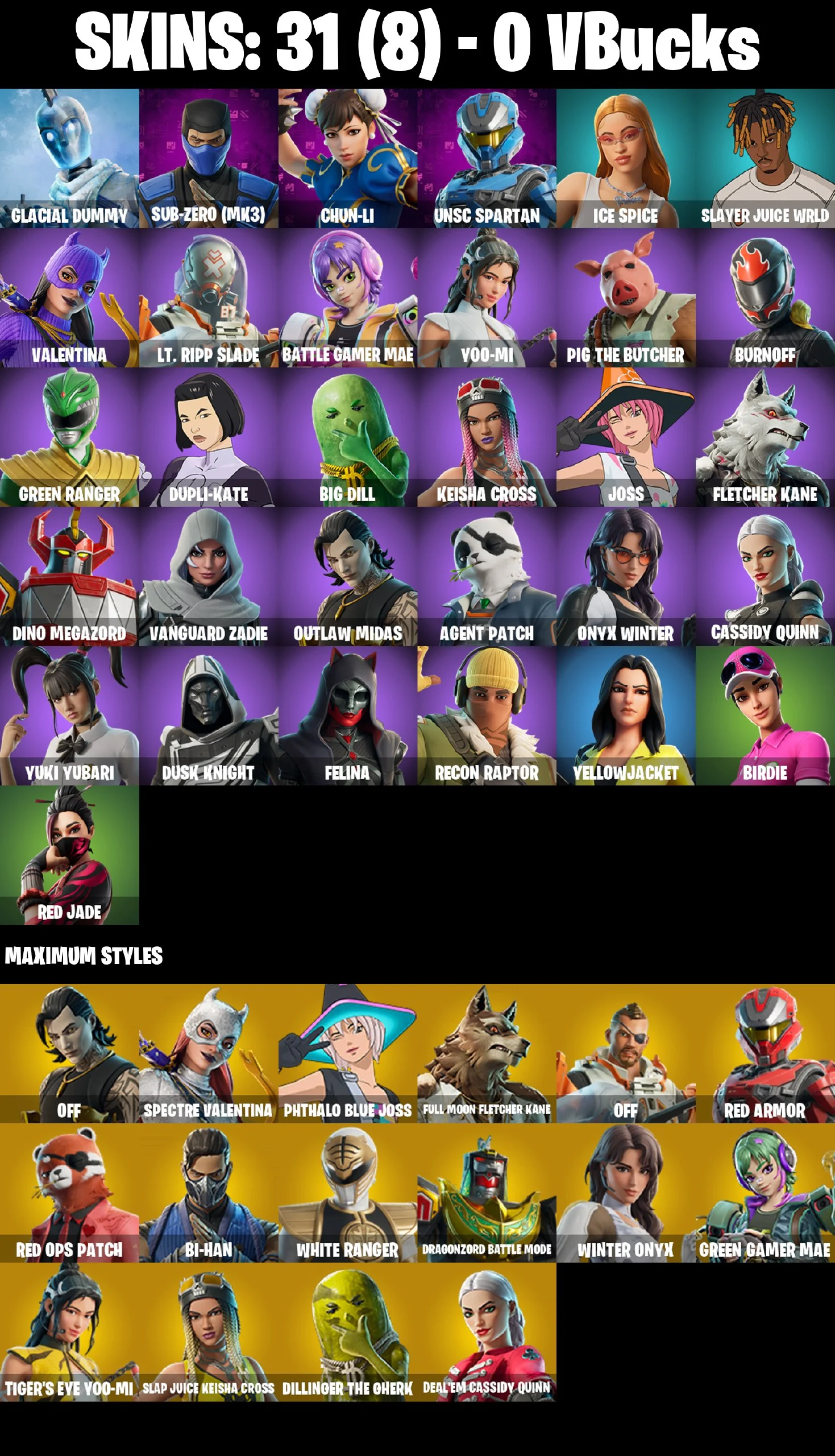 [PC/PSN/XBOX] 31 skins | Chun-Li | Jabba Switchway | Popular Vibe | Glacial Dummy | Sub-Zero (MK3) | UNSC Spartan | Ice Spice | Slayer Juice WRLD | Valentina | Lt. Ripp Slade | 0 VB