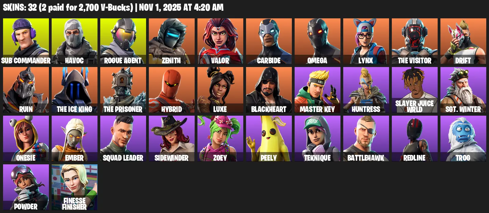 [PC/PSN/XBOX] | 32 skins | 550 V-bucks | Omega | Sub Commander | Havoc | Rogue Agent | Zenith | Valor | Carbide | Lynx | The Visitor | Drift | S4G