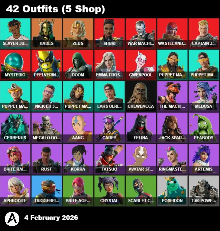 | PC/PSN/XBOX | 42 Skins | Juice WRLD | Puppet Master Robert | Puppet Master Lars | Puppet Master James | Nick Eh 30 | Puppet Master Kirk | Lars Ulrich | Hades | Zeus | Shuri | War Machine | Eh Crown