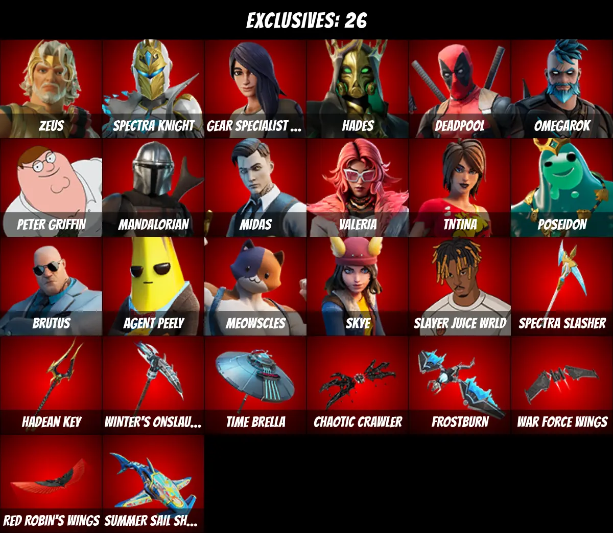 โกPC/PSN/XBOXโก 53 skins ๐ Deadpool ๐ Midas ๐ Mandalorian ๐ Agent Peely ๐ Zeus ๐ Meowscles ๐ Hades ๐ TNTina ๐ Brutus ๐ Peter Griffin ๐ Poseidon ๐ Slayer Juice Wrld ๐ Valeria ๐ Skye ๐ Omegarok ๐ Spectra Knight ๐ Gear Specialist Maya ๐ 1450 V-Bucks ๐