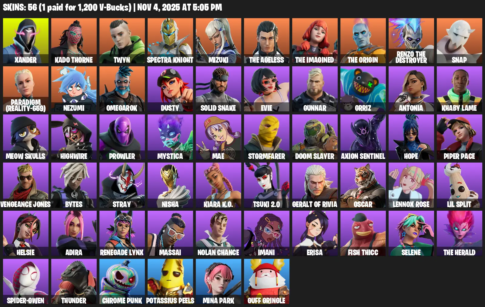 π¨ [PC/PSN/XBOX] π 56 skins | Xander , Kado Thorne , Twyn , Spectra Knight , Mizuki , The Ageless , The Imagined , The Origin , Renzo the Destroyer | π 500 VBUCKS | βοΈ Changeable Email Now