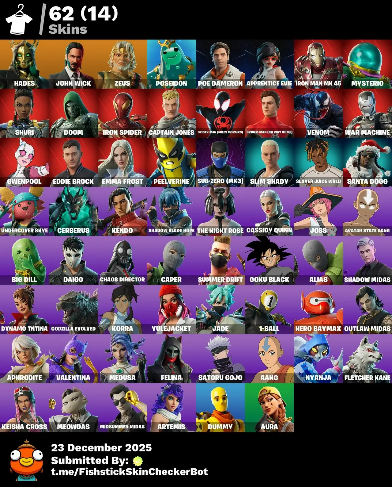 [PC/PSN/XBOX] 62 Skins | Hades | John Wick | Zeus | Poseidon | Poe Dameron | Apprentice Evie | Iron Man Mk 45 | Mysterio | Shuri | Doom | Iron Spider | 600 VB | FN2