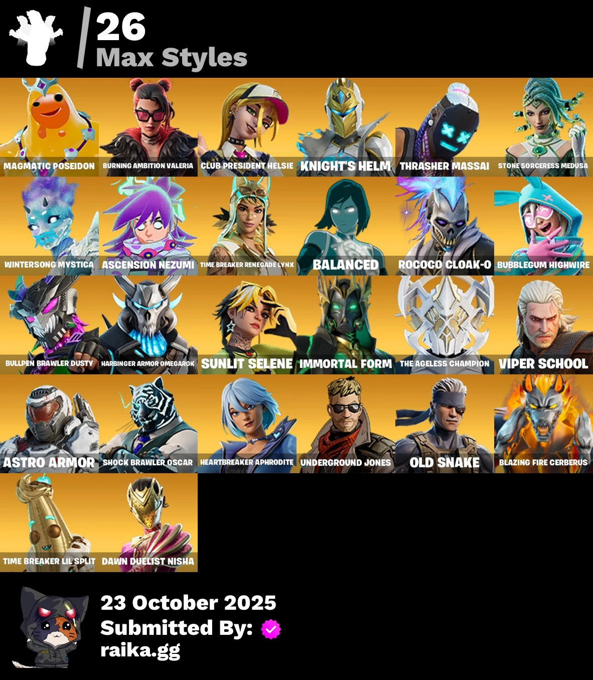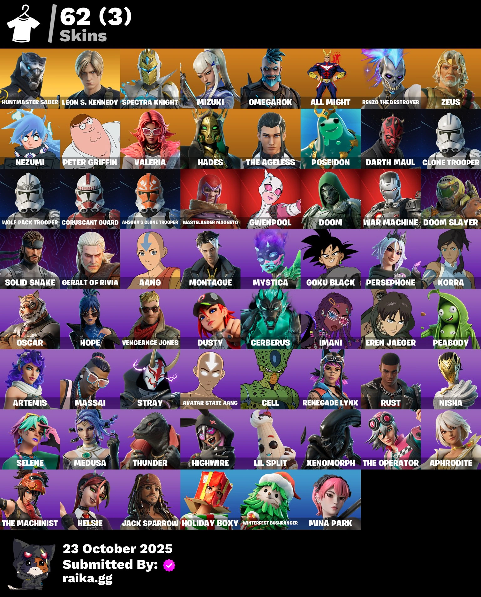 [PC/PSN/XBOX] 62 skins | Huntmaster Saber | Leon S. Kennedy | Spectra Knight | Mizuki | Omegarok | All Might | Renzo the Destroyer | Zeus | Nezumi | 550 VB