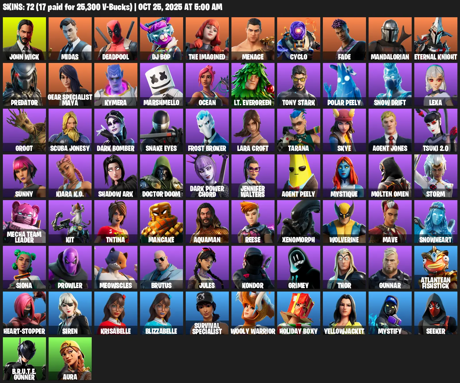 [PC/PSN/XBOX] | 72 skins | Leviathan Axe | Lara Croft | John Wick | Midas | Deadpool | DJ Bop | The Imagined | Menace | Cyclo | Fade | S4G