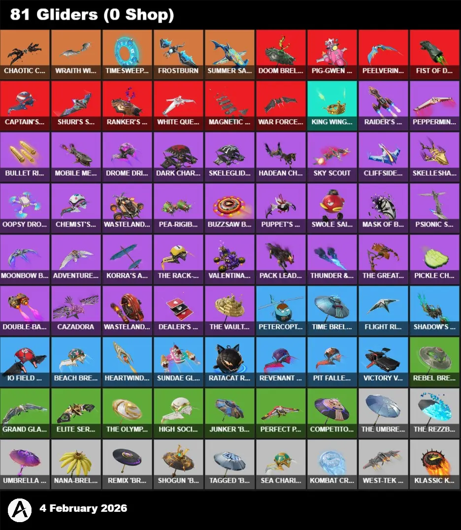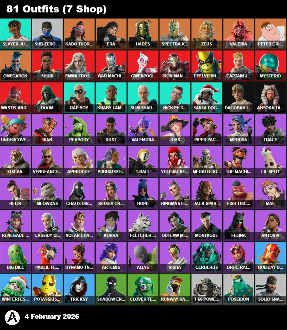 | PC/PSN/XBOX | 81 Skins | Sub-Zero | Juice WRLD | Rap Boy | Khaby Lame | Slim Shady | Nick Eh 30 | Santa Dogg | Kado Thorne | Era | Hades | Spectra Knight | Zeus | Valeria | Peter Griffin | Omegarok