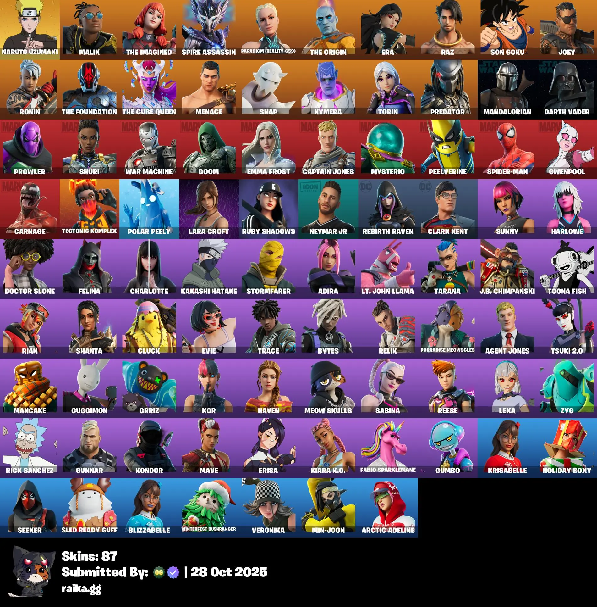 [PC/PSN/XBOX] 87 skins | Naruto Uzumaki | Malik | The Imagined | Spire Assassin | Paradigm (Reality-659) | The Origin | Era | Raz | Son Goku | Joey | Ronin | 1300 VB