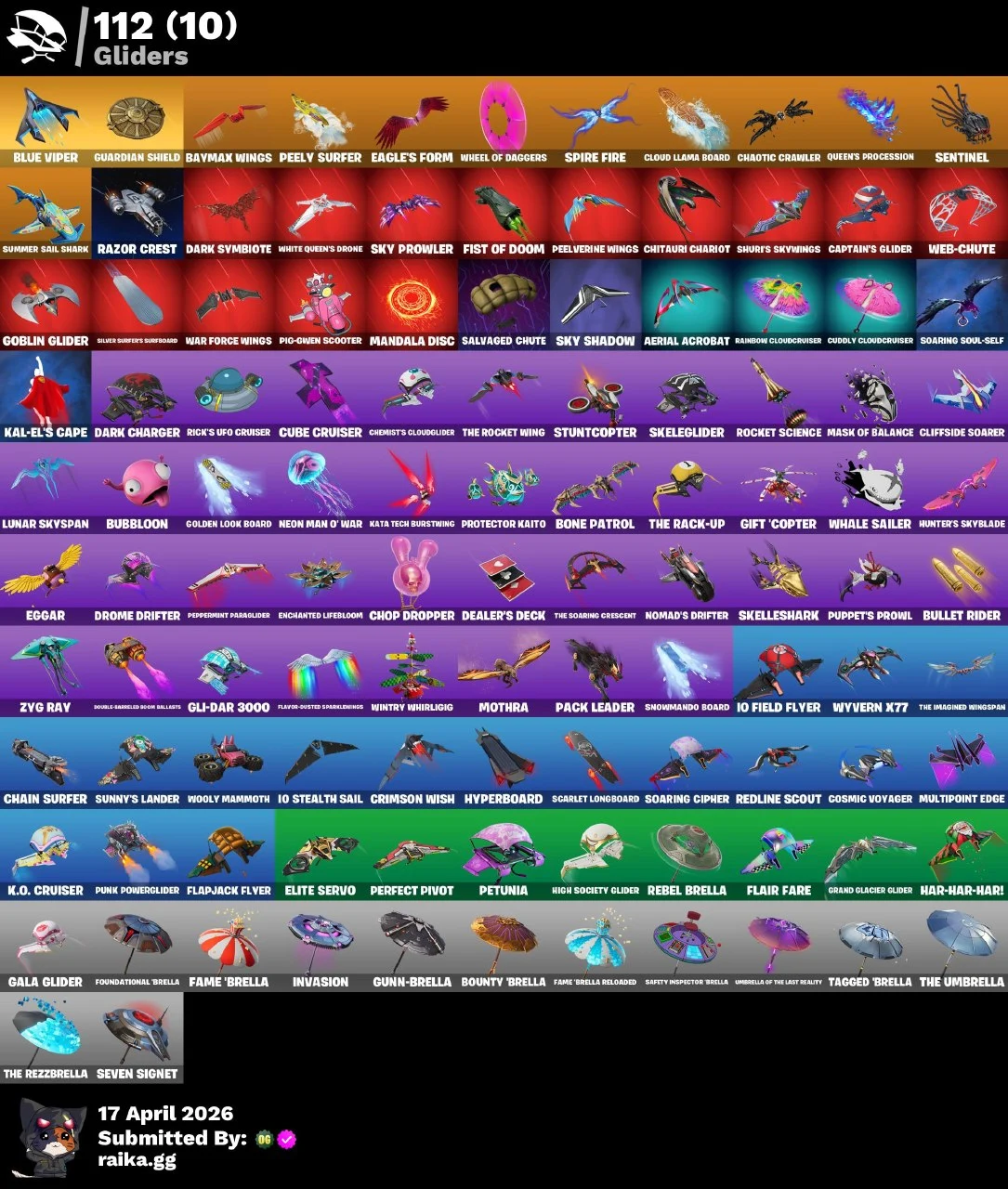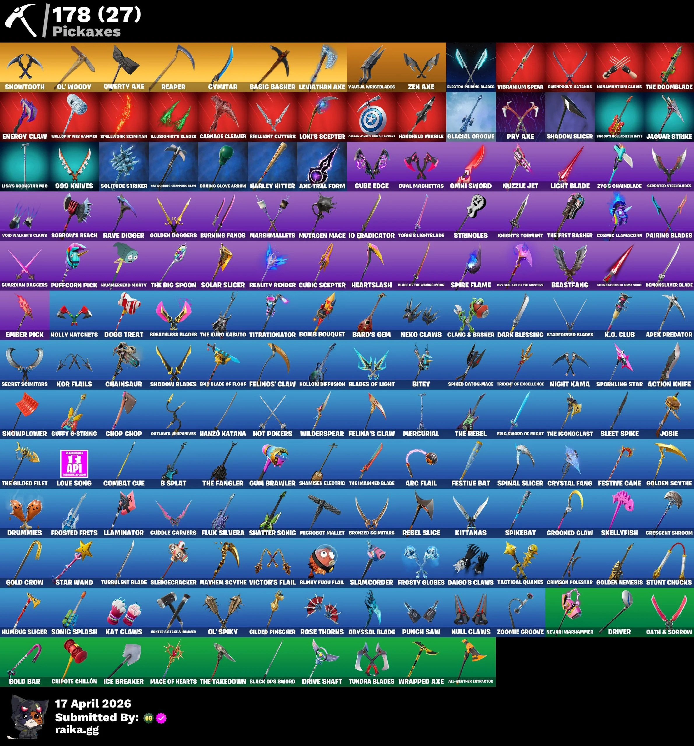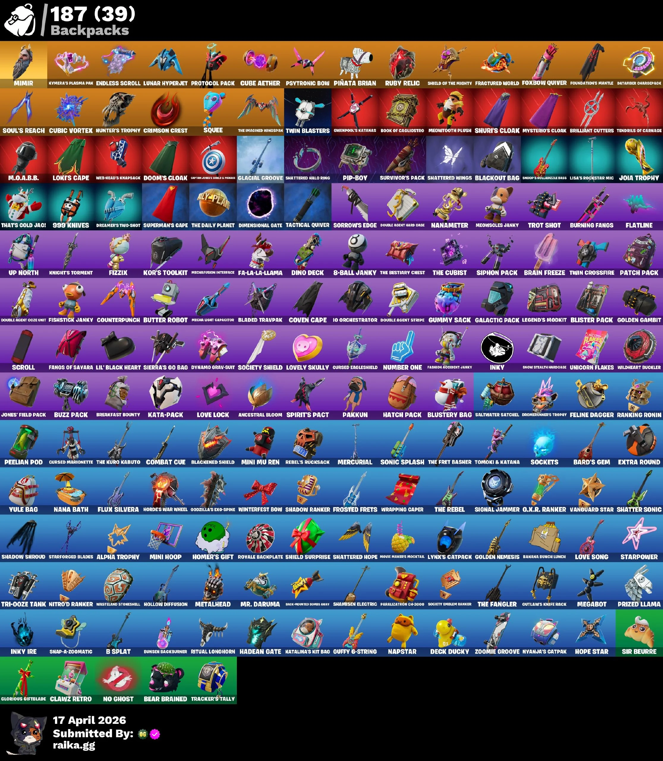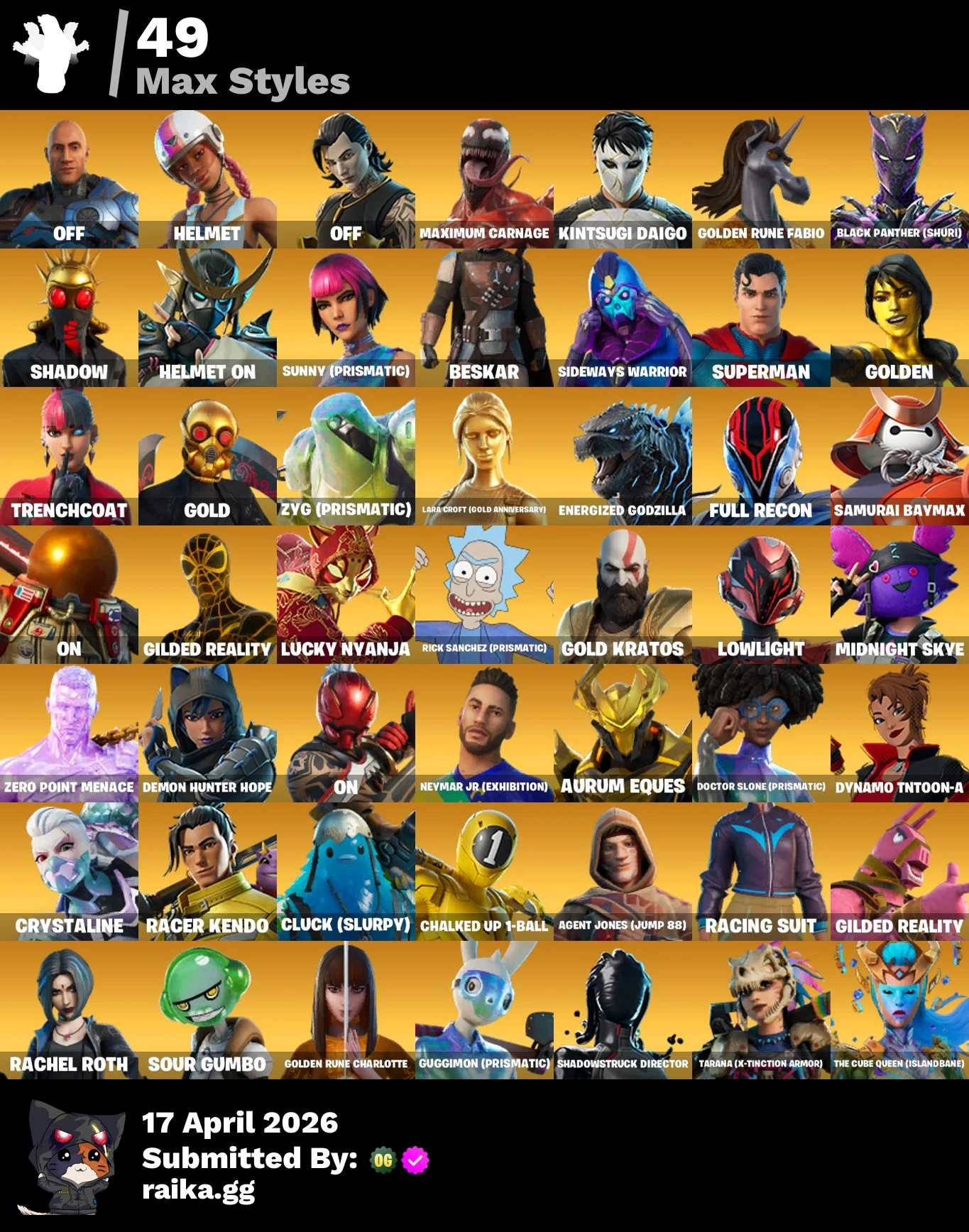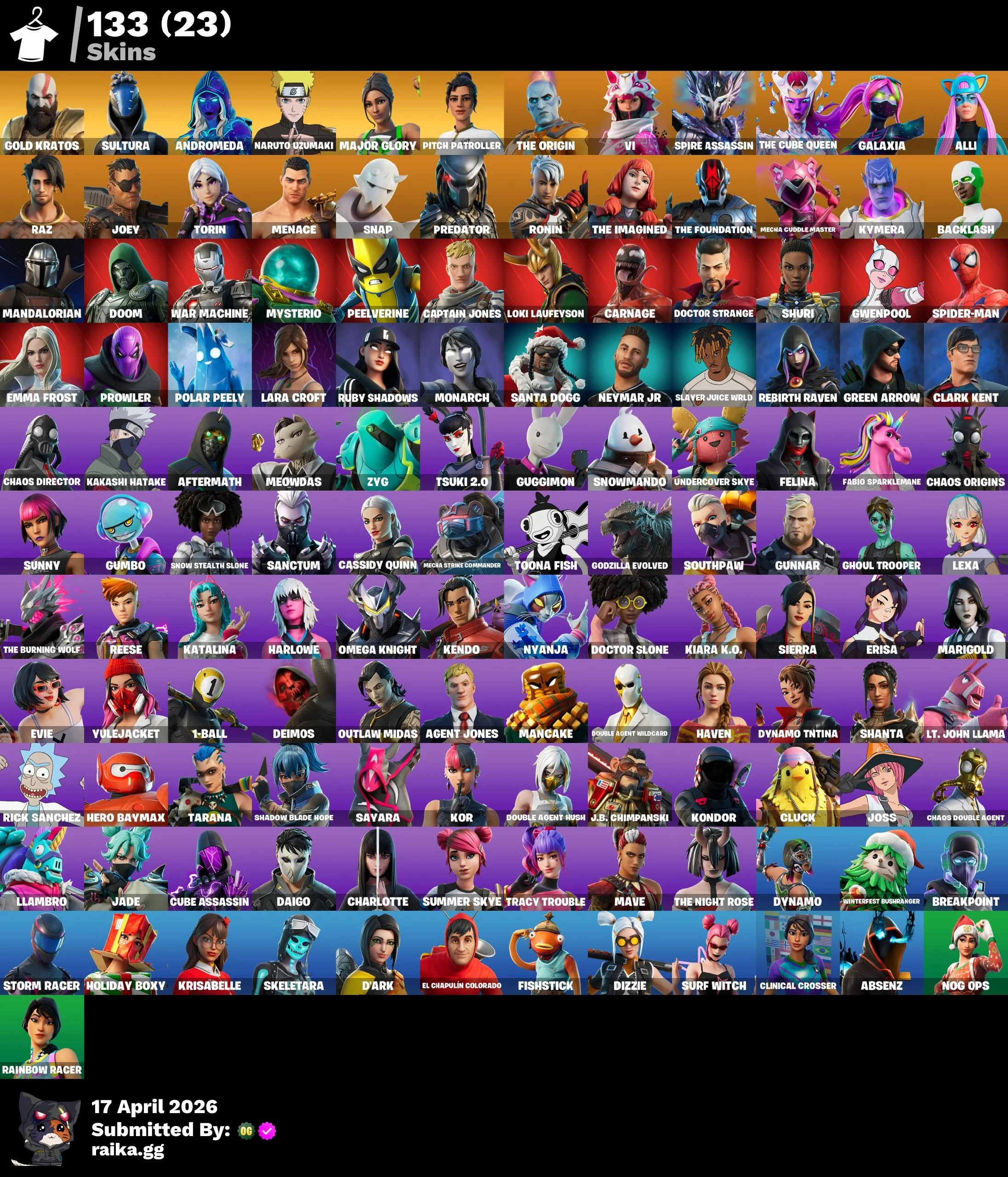 PC/PSN/Xbox/Nintendo 133 skins Leviathan Axe | Pitch Patroller | Vi | Naruto Uzumaki | Gold Kratos | Sultura | Andromeda | Major Glory | The Origin | Spire Assassin | 300 VB