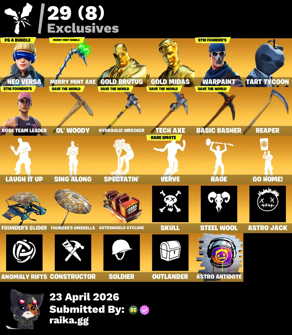 [PC/PSN/XBOX/Nintendo] 175 skins F/A : Merry Mint Axe | OG STW | Renegade Raider | Neo Versa | Gold Midas | Gold Brutus | Tart Tycoon | Mizuki | Malik | Hybrid | Eternal Knight | Ruin