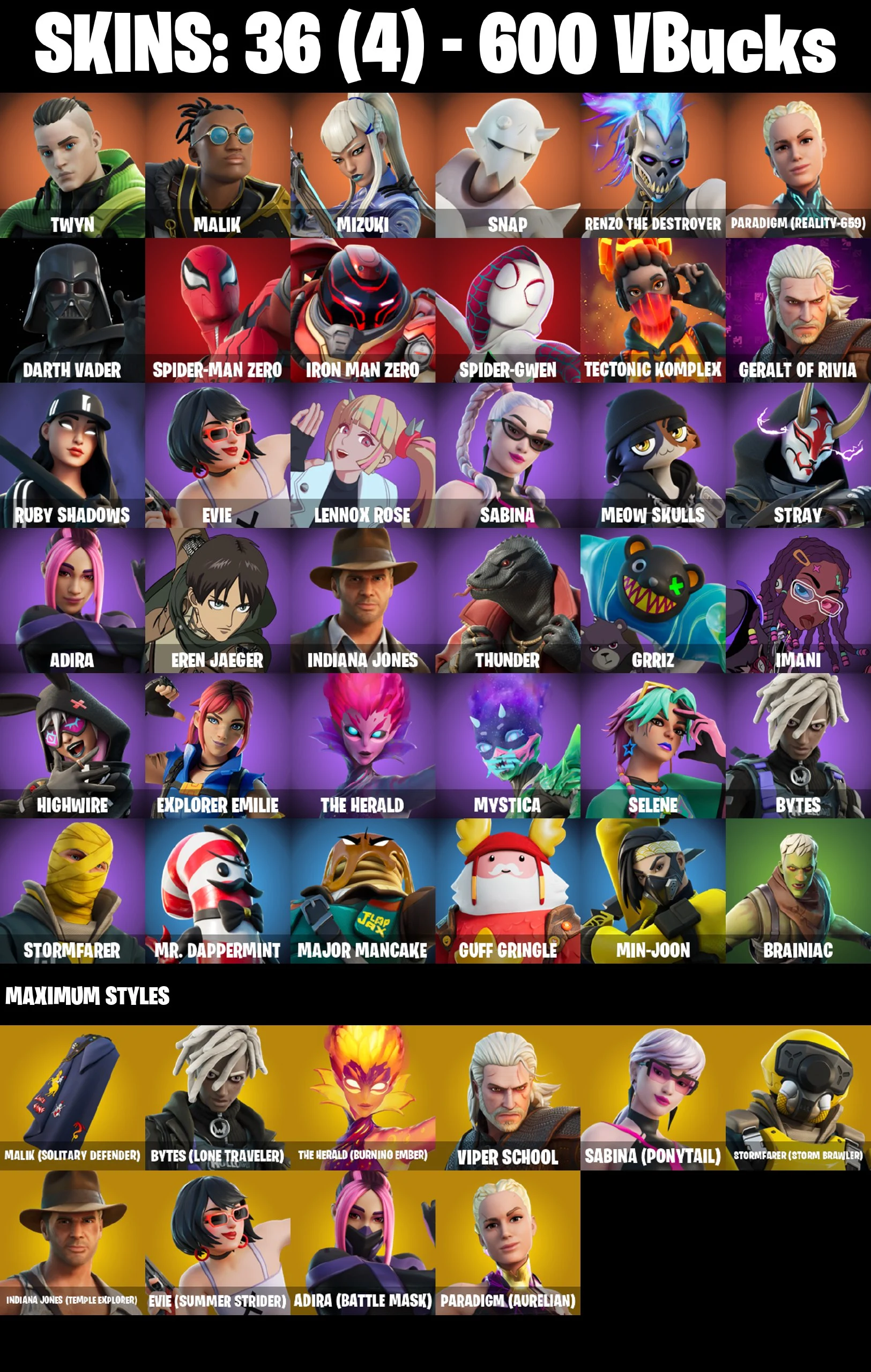⭐ [PC/PSN/XBOX/NINTENDO/MOBILE] 36 SKINS | IRON MAN ZERO | SPIDER-GWEN | SPIDER-MAN ZERO | DARTH VADER | EVIE | EREN JAEGER | MEOW SKULLS | HIGHWIRE | BRAINIAC | 600 VBUCKS | EMAIL