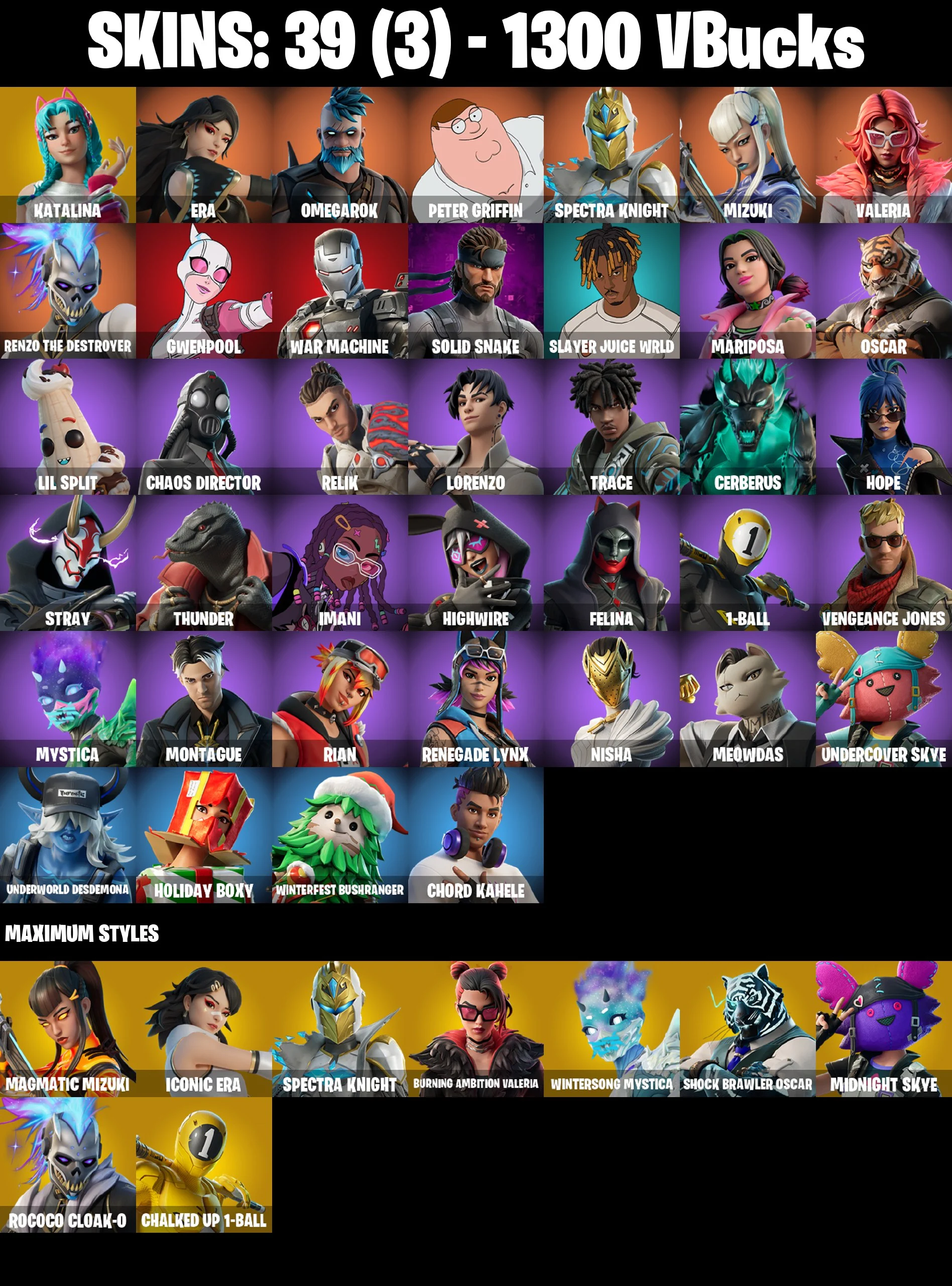 ⭐ [PC/PSN/XBOX/NINTENDO/MOBILE] 39 SKINS | OMEGAROK | SPECTRA KNIGHT | KATALINA | PETER GRIFFIN | NISHA | CHAOS DIRECTOR | MEOWDAS | UNDERCOVER SKYE | HIGHWIRE | CHORD KAHELE | 1300 VBUCKS | EMAIL