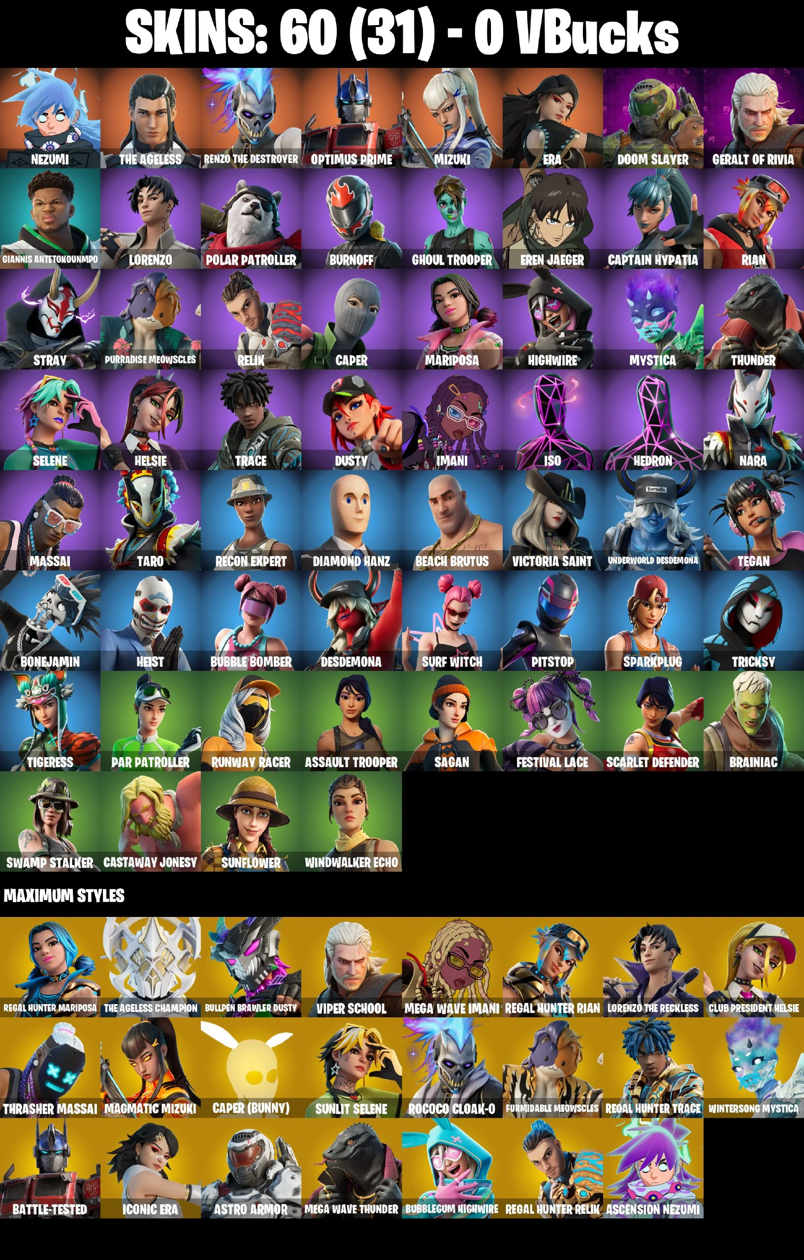 ⭐ [PC/PSN/XBOX/NINTENDO/MOBILE] 60 SKINS | NEZUMI | THE AGELESS | RENZO THE DESTROYER | OPTIMUS PRIME | MIZUKI | ERA | DOOM SLAYER | GERALT OF RIVIA | GIANNIS ANTETOKOUNMPO | LORENZO | POLAR PATROLLER | BURNOFF | GHOUL TROOPER | 0 VBUCKS | EMAIL