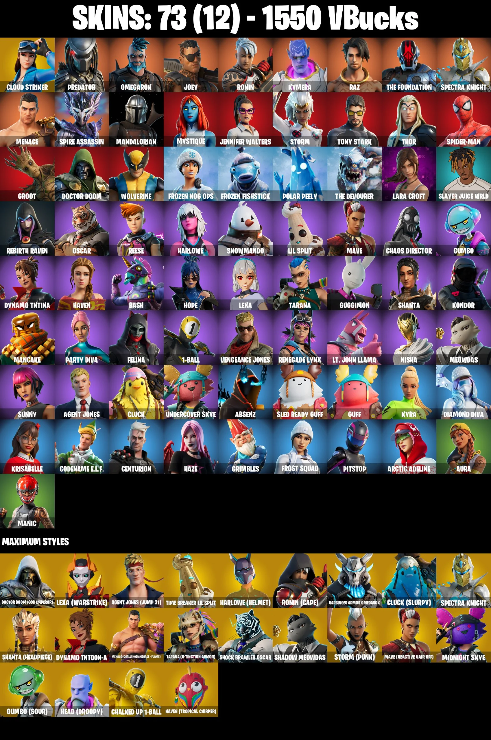 ⭐ [PC/PSN/XBOX/NINTENDO/MOBILE] 73 SKINS | CLOUD STRIKER | SPIDER-MAN | MANDALORIAN | SPECTRA KNIGHT | TONY STARK | THOR | LARA CROFT | REBIRTH RAVEN | PARTY DIVA | MEOWDAS | RENEGADE LYNX | GRIMBLES | NISHA | KYRA | MANIC | AURA | 1550 VBUCKS | EMAIL