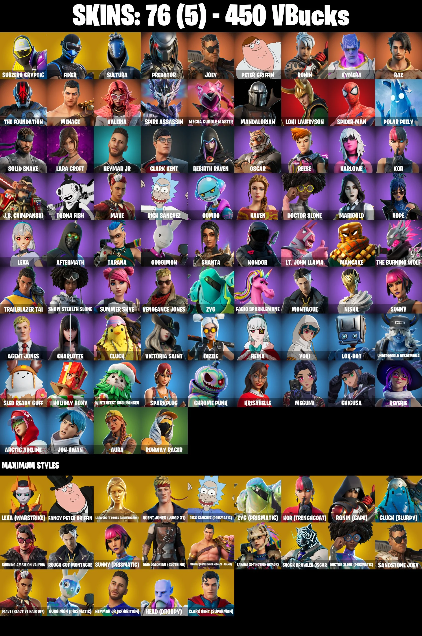 ⭐ [PC/PSN/XBOX/NINTENDO/MOBILE] 76 SKINS | SPIDER-MAN | SUBZERO CRYPTIC | PETER GRIFFIN | REBIRTH RAVEN | LARA CROFT | CHARLOTTE | MARIGOLD | AURA | MY WORLD | SQUARE UP | REAPER | 450 VBUCKS | EMAIL