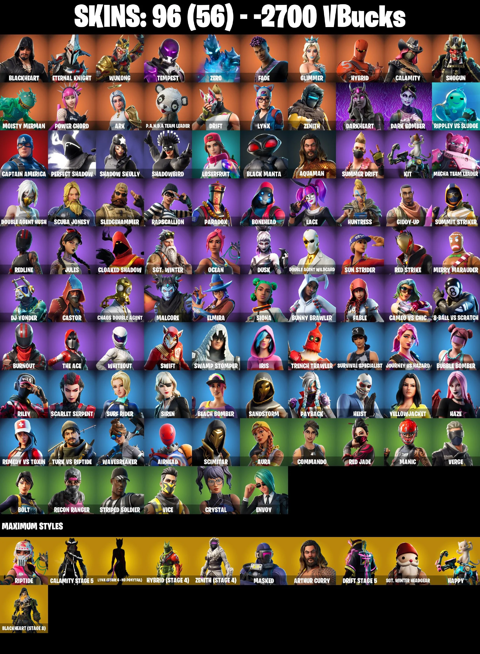 ⭐ [PC/PSN/XBOX/NINTENDO/MOBILE] 96 SKINS | DRIFT STAGE 5 | SHOGUN | ZERO | ETERNAL KNIGHT | CAPTAIN AMERICA | TEMPEST | LOSERFRUIT | AQUAMAN | BLACK MANTA | MERRY MARAUDER | DUSK | LACE | SUMMER DRIFT | CLOAKED SHADOW | RAPSCALLION | -2700 VBUCKS | EMAIL