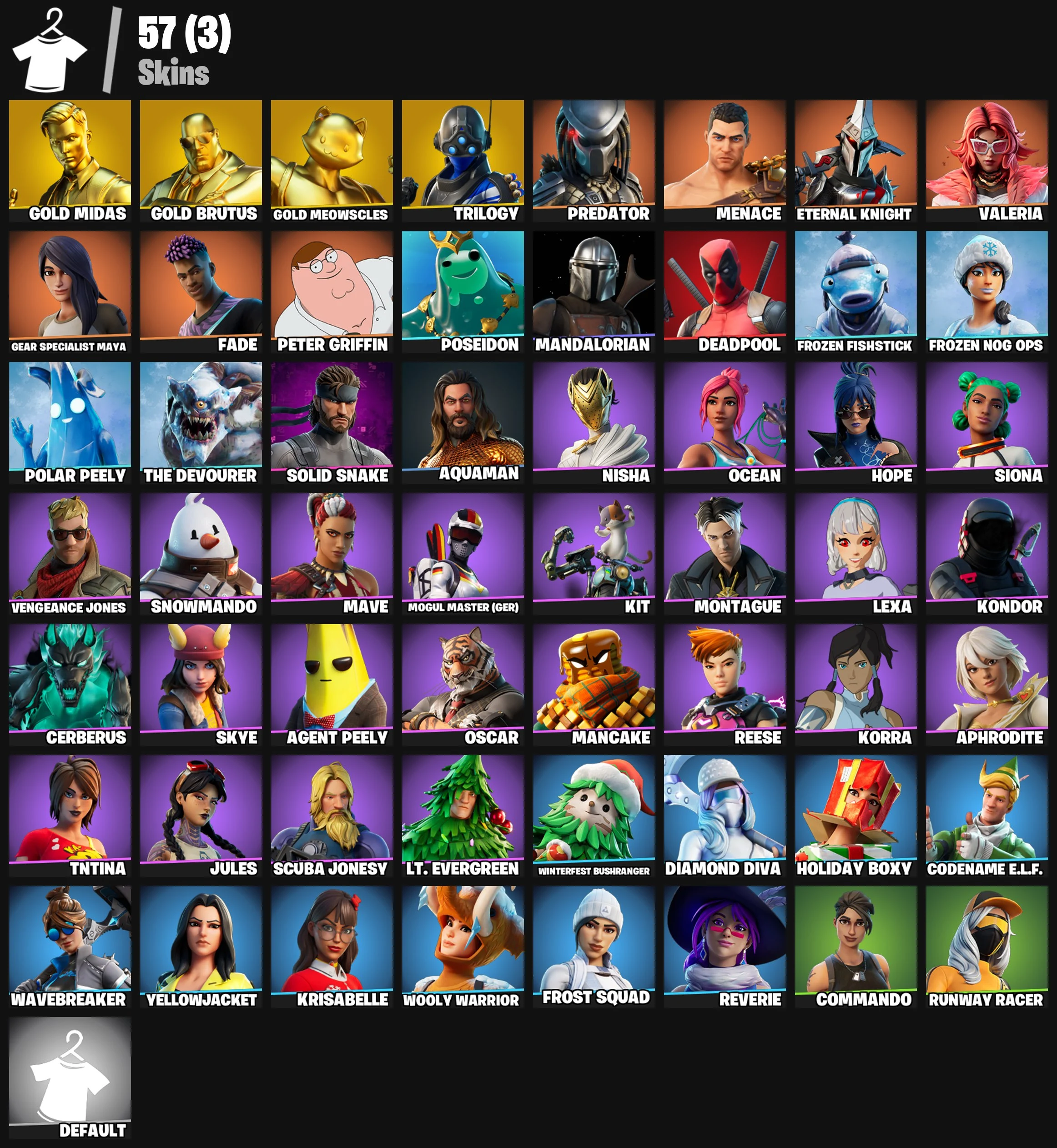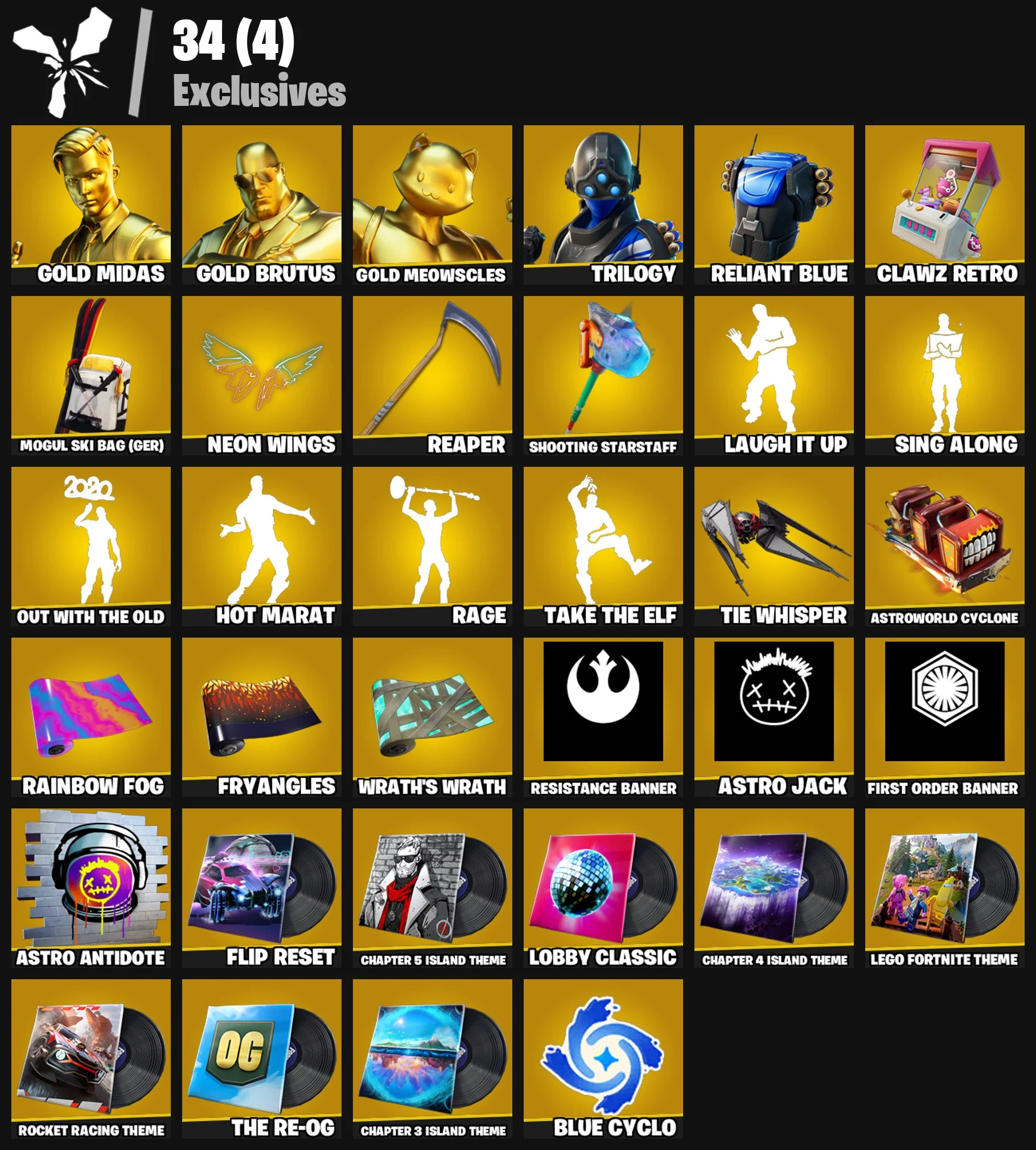 [PC/PSN/XBOX/SWITCH] 57 Skins | Gold Midas | Gold Brutus | Gold Meowscles | Agent Peely | Trilogy | Reliant Blue | Clawz Retro | 20 VB | Email Changeable