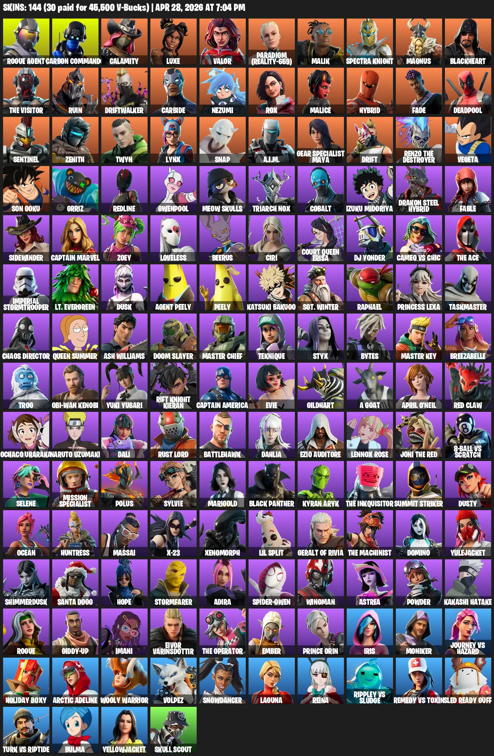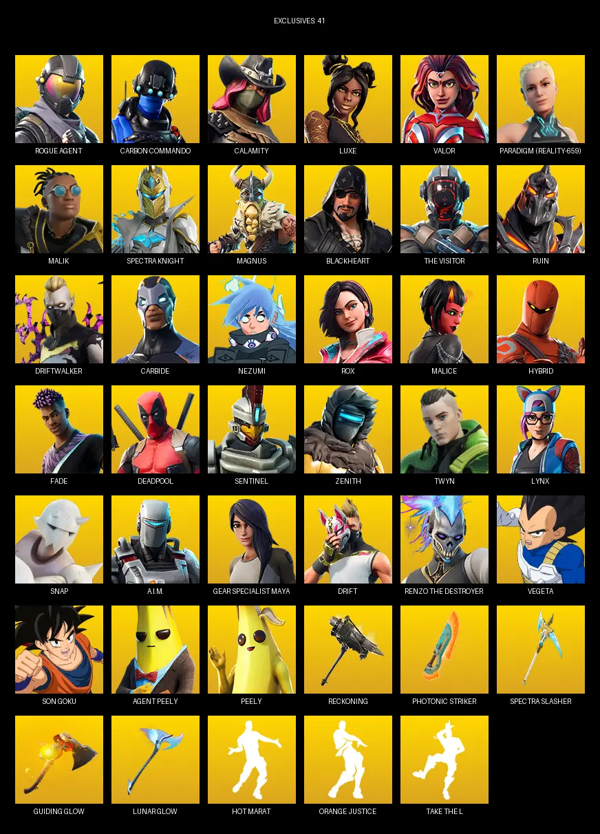 [PC/XBOX] | 144 skins | 1350 V-bucks | Take The L | Rogue Agent | Carbon Commando | Calamity | Luxe | Valor | Paradigm (Reality-659) | #WTG2606
