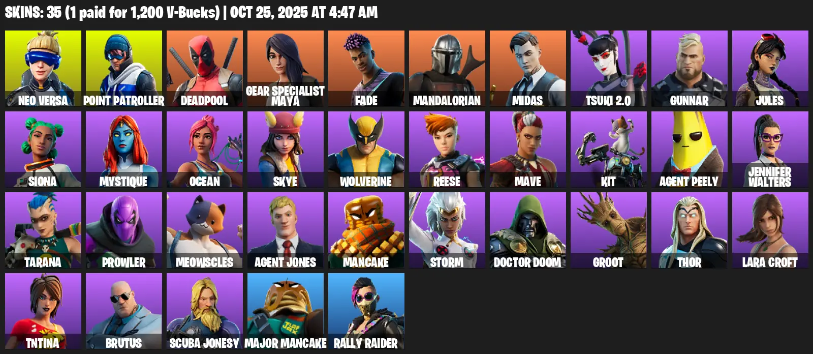 [PC/XBOX] | 35 skins | Lara Croft | Neo Versa | Point Patroller | Deadpool | Gear Specialist Maya | Fade | Mandalorian | Midas | Tsuki 2.0 | S4G