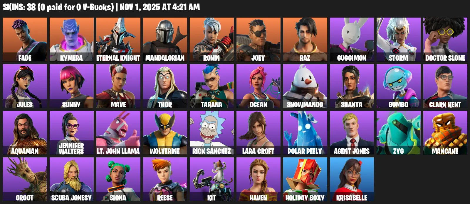 [PC/XBOX] | 38 skins | Lara Croft | Fade | Kymera | Eternal Knight | Mandalorian | Ronin | Joey | Raz | Guggimon | Storm | Doctor Slone | Jules | S4G