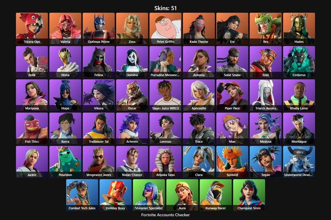 PC/XBOX 51 Skins⚡ | Tricera Ops | Valeria | Optimus Prime | Zeus | Peter Griffin | Kado Thorne | Era | Rex | Hades | Relik | Nisha | Felina | Domino