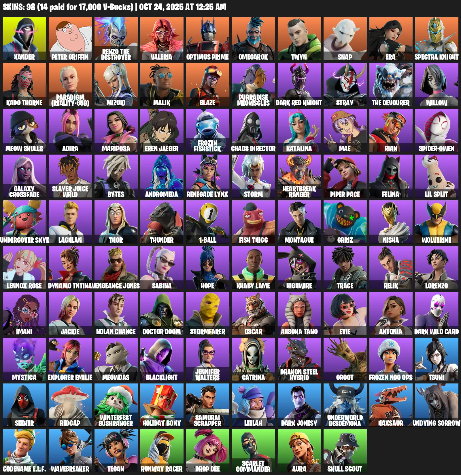 [PC/XBOX/PSN] 98 Skins | Xander | Peter Griffin | Renzo the Destroyer | Valeria | Optimus Prime | Omegarok | Twyn | Snap | Era | Spectra Knight | Kado Thorne | Paradigm (Reality-659) | Mizuki | Malik | Blaze | Purradise Meowscles | Dark Red Knight | Stray